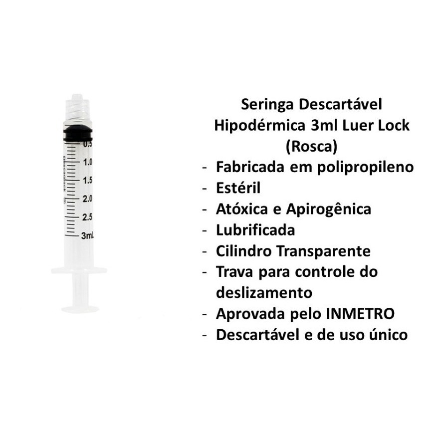 | Seringa 3ml Luer Lock Unidades Descarpack **ENVIO IMEDIATO** este produto | R$ 32,99 | 21% | 4.8/5 | 141 |