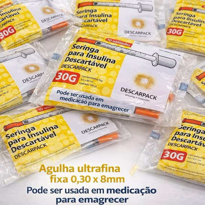 Seringa de Insulina 50ui com Agulha Ultrafina 6x0,25mm Descarpack Características Principais: - Fabricada em polipropileno, esta seringa é estéril e atóxica, garantindo segurança durante o uso. - A agulha ultrafina de 6x0,25mm proporciona uma aplicação suave e confortável. - O corpo transparente permite visualizar facilmente o nível do medicamento. Indicações de Uso: - Ideal para aplicação de insulina e Botox via subcutânea. - Indicada para uso em hospitais, clínicas, laboratórios, farmácias ou no domicílio. Modo de Uso: 1. Abra a embalagem com técnica asséptica. 2. Retire o produto da embalagem primária. 3. Destrave o êmbolo para lubrificar a borracha de ajuste. 4. Remova a capa protetora da agulha e inicie o procedimento de punção. 5. Retraia o êmbolo lentamente para aspirar o líquido, evitando bolhas. 6. Siga as instruções do médico para administração. 7. Descarte o produto após o uso. Cuidados e Dicas: - Não reutilize. Uso único e descartável. - Consulte sempre um profissional de saúde para orientações sobre o uso. Escolha a quantidade ideal para suas necessidades: 10, 20 ou 50 unidades. Com a Seringa de Insulina 1ml, você tem precisão e segurança em cada aplicação!