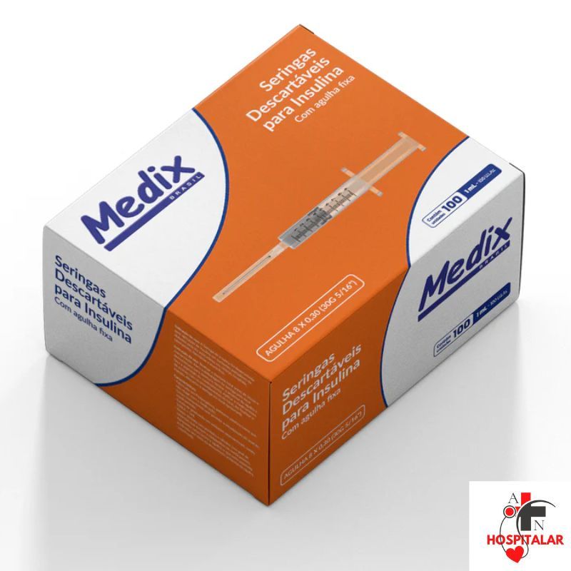 Seringa de Insulina 1ml 100UI com Agulha Fixa 8 x 0,30 - Fracionado 50 Unidades Apresentação Dispositivo de uso médico-hospitalar, para uso manual. Destinada à infusão de soluções (Insulina e Vacinas) via subcutânea ou intradérmica, conforme técnicas de administração orientadas pelos médicos. Benefícios Estéril; Fácil utilização. Modo de Uso 1 - Abra a embalagem com técnica asséptica;2 - Retire o produto da embalagem primária;3 - Destrave o êmbolo da seringa no sentido do canhão a fim de lubrificar a borracha de ajuste ou mobilizar o êmbolo;4 - Retire a capa protetora da agulha conectada à seringa (se tiver) e inicie o procedimento depunção ou infusão de solução;5 - Retraia o êmbolo e aspire lentamente o líquido para o interior da seringa, evitando bolhas;6 - Siga as instruções de administração orientadas pelo médico;7 - Após o uso, descartar o produto. Uso único. Não reutilizar. Especificações técnicas Conexão: Agulha fixa - Tipo 8; Graduação 2 em 2 UI; Contém látex; Material e composição;Seringa: Cilindro - polipropileno; Êmbolo - borracha; Haste - polipropileno; Flange do cilindro - polipropileno; Capa protetora - polipropileno;Agulha: Cânula - aço inoxidável SUS304; Canhão - polipropileno; Capa protetora - polipropileno; Validade: 5 anos após a data de esterilização; Embalagem: Caixa com 100 unidades; Dimensões produto: Agulha fixa 8x0,30. 30G 5/16''. 100UI. 1ml; Dimensões embalagem: 15cm(c) x 18cm(l) x 11cm(a); Peso embalagem: 50g; Registro Anvisa 80495519006; Possui selo Inmetro.