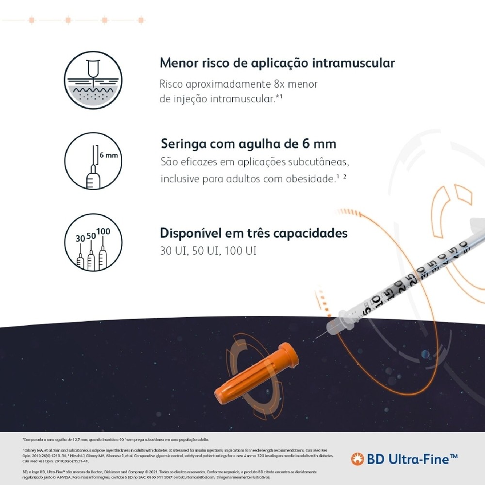Seringa para aplicação de insulina, de uso único, com escala graduada de 0,5 em 0,5 unidade, com agulha fixa (integrada) de 6mm (15/64") de comprimento x 0,25 mm (31 G) de diâmetro, sem espaço residual e com capacidade para até 30 UI de insulina. Possui protetor de êmbolo.