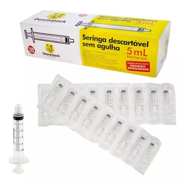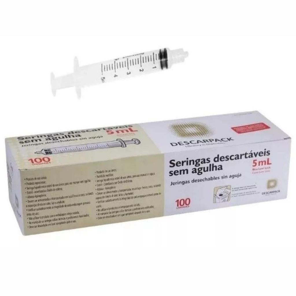 Seringa Descartável Sem Agulha Bico Rosca Dupla 5ml - 100 Uni Capacidade Em Volume 5 Ml