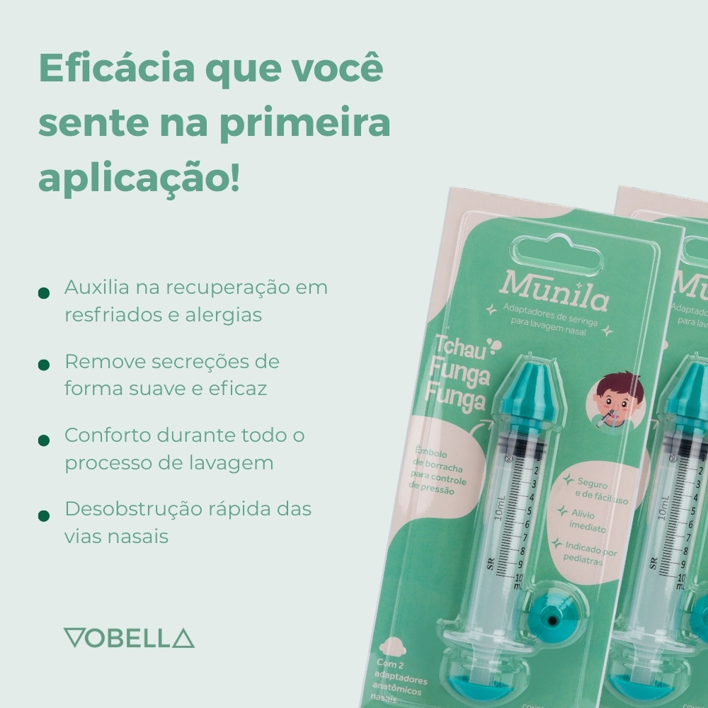 A Seringa Lavagem Nasal Com Adaptador Munila foi desenvolvida para tornar o momento da higienização nasal mais leve, eficiente e seguro, especialmente para bebês e crianças. Com design anatômico e material macio, proporciona alívio imediato e ajuda na prevenção de problemas respiratórios com muito mais carinho. Por que comprar a Seringa Lavagem Nasal Munila? Ideal para rotinas de cuidado infantil, a seringa acompanha adaptadores anatômicos que se ajustam ao nariz da criança, tornando o processo confortável e mais eficaz. Um aliado essencial no combate ao desconforto respiratório, com uso fácil e indicado por pediatras. Sobre o produto: -Seringa Lavagem Nasal Com Adaptador Munila 1un. -Marca: Munila. -Contém: 1 seringa + 2 adaptadores + stopper de borracha. -Recomendado por pediatras. -Bico anatômico macio. -Seguro e reutilizável. -Ideal para uso com soro fisiológico. -Alívio imediato da congestão nasal. -Higienização eficaz e delicada. Indicado para: -Bebês a partir de 6 meses. -Crianças. -Alívio de sintomas de resfriados, rinite e congestão. Modo de uso: -Encha a seringa com 5 a 10ml de soro fisiológico. -Incline o corpo para frente e a cabeça suavemente para o lado. -Posicione o adaptador na narina e pressione até que o soro saia pela outra narina. -Durante o processo, mantenha a boca aberta para facilitar a respiração. -Em bebês e crianças, o uso deve ser feito com supervisão e em posição confortável. Precauções de uso: -Uso externo. -Não compartilhe o produto com outras pessoas. -Mantenha fora do alcance de crianças sem supervisão. -Substitua o produto a cada 6 meses. -Higienize antes e após o uso. -Em caso de irritação, suspenda o uso e procure orientação médica. -Consulte um profissional de saúde para ajustar o fluxo ideal. Com formato anatômico e aplicação suave, a Seringa Lavagem Nasal Munila é a escolha certa para quem busca praticidade, segurança e bem-estar respiratório. Cuide de quem você ama com mais carinho e eficácia. Surgiu alguma dúvida? Entre em contato com a gente! Boas Compras :)