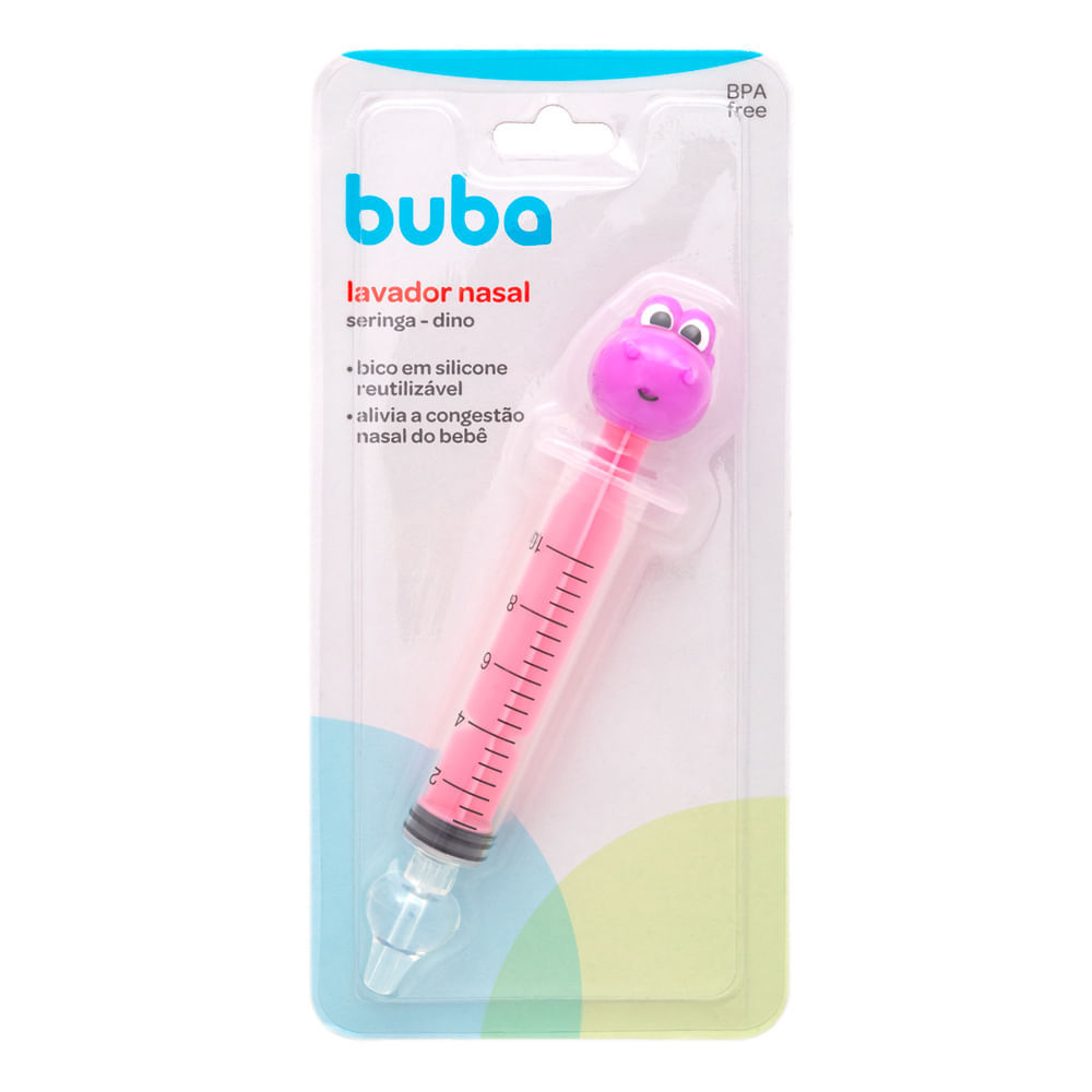 Seringa para Lavagem Nasal Buba Dino Rosa. Possui bico de silicone reutilizável. Alivia a congestão nasal do bebê.