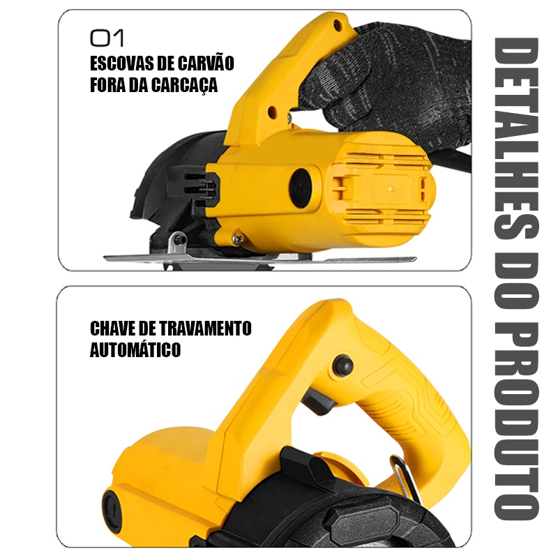 O gabarito ou guia de corte 45° foi desenvolvido para que poupe e facilite o trabalho na hora do corte. O guia de 45° é para cortes meia esquadria, feitos em pisos de porcelanato, cerâmicas, usados na projeção de bancadas, rodapé, escadas e outros. É simples de usar, não necessita de ferramentas externas para a instalação na sua máquina de corte. O corte precisa ser feito em pisos planos. O corte pode ser feito em peças úmidas ou á seco. Corte limpo e que proporciona um acabamento incrível. De material leve para facilitar o trabalho, corte feito de forma precisa! CARACTERÍSTICAS: - Facilita o corte e já possui encaixe delimitado; - Corta uma variedade de pisos; - Adequado para muito modelos de máquina de corte. PARA QUALQUER TIPO DE PISO: Porcelanatos, granitos, pedras, mármores e cerâmicas. Além de pisos, é possível cortar madeiras e MDF também. Para cortes em mármore, tome um pouco de cuidado, pois, a espessura do mármore é um pouco maior. FIXAÇÃO: A fixação não exige ferramentas externas. Há parafusos borboletas para a fixação da guia. A abertura para encaixe da serra é para serras de disco de 110mm. COMPATÍVEL COM MUITAS MARCAS, modelo universal: Makita, Bosch e outros. ESPECIFICAÇÕES: Material do corpo: Alumínio Material das rodas: Nylon LISTA DE EMBALAGEM: 1x Guia de Corte 45° Corte 45° Graus Meia Esquadria Chanfro Serra Mármore Circular B 👉 traz mais uma Serra Circular de alta capacidade para você realizar seus trabalhos com madeira com mais rapidez e eficiência. Forte motor de 2000W para discos de 180mm. ✔️ CARACTERÍSTICAS TÉCNICAS: - Marca: Songhe Tools - Potência:1550W • Cordão elétrico com 1,5m; • Compatível com disco de corte de 110mm (4.3/8”) • Ajuste de ângulo e profundidade de corte • Chave de acionamento com trava dupla, mais segura • 13000RPM • 1550W • Disponível em220V • Material: metal e plástico Distância do furo interno 22mm