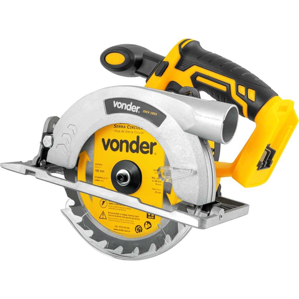 PRODUTO PRONTA ENTERGA COM ENVIO IMEDIATO Conteúdo da Embalagem: 1 Serra circular. Acompanha: 1 guia lateral, 1 chave allen e 1 lâmina de serra circular. Este equipamento utiliza um modelo de bateria que pode ser intercambiável (não acompanha), ou seja, uma bateria que é compatível com outros modelos de ferramentas a bateria VONDER. Por isso, em sua próxima compra de ferramenta a bateria VONDER, procure por um modelo que comece com a referência "I", ou que esteja identificado com o selo "Bateria Intercambiável VONDER". Desta forma, você garante modelos mais econômicos, sem a necessidade de aquisição de novas baterias e carregadores para uso em seu equipamento. Possui ajuste de profundidade de corte e regulagem de ângulo de até 50°. Indicada para cortar somente madeiras e derivados. Não acompanha bateria e carregador. BATERIAS INDICADAS: (4 Ah) IBV 1804 - 60.04.180.400 (5 Ah) IBV 1850 - 60.04.185.000 (8 Ah) IBV 1880 - 60.04.188.000 CARREGADORES INDICADOS: Carregamento convencional ICBV 1805 - 60.04.180.500 Carregamento convencional duplo ICBV 1841- 60.04.184.100 Carregamento rápido ICBV 1806 - 60.04.180.600 Carregamento rápido duplo ICBV 1842 - 60.04.184.200 Carregador inteligente ICBV 1849 - 60.04.184.900 Carregador convencional com conector automotivo 12 V ICBV 1843 - 60.04.184.300. Garantia legal: 90 dias + Garantia contratual: 9 meses (Para locadoras, garantia única e exclusiva de 90 dias)