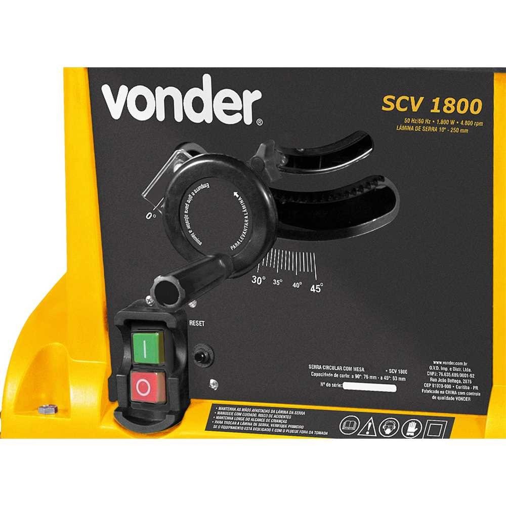 Serra circular com mesa, 10", 1.800 W, 220 V~, SCV 1800, VONDER Possui guia lateral, esquadro para ângulos, proteção da lâmina em acrílico e regulagem de ângulo e de altura da serra. Indicada para cortar madeiras e derivados. Especificações: Modelo: SCV 1800 Potência: 1.800 W Diâmetro da lâmina (pol/mm): 10" - 254 mm Diâmetro do eixo: 16,0 mm Capacidade de corte 90º: 76,0 mm Capacidade de corte 45°: 63 mm Ângulo de inclinação da serra: Até 45° Rotações por minuto (rpm): 4.800/min Comprimento da mesa: 660,0 mm Largura da mesa: 480,0 mm Altura da mesa: 890,0 mm Tensão (V~): 220 V~ Frequência (Hz): 50 Hz / 60 Hz Segue norma: ABNT NBR IEC 60745-1 e ABNT NBR IEC 60745-2-5 Massa aproximada (peso) (kg): 17,50 kg Conteúdo da Embalagem: 1 Serra circular com mesa. Acompanha: 1 lâmina de serra de 10" (16,0 mm), 1 chave allen, 1 chave de boca e 1 chave estrela.