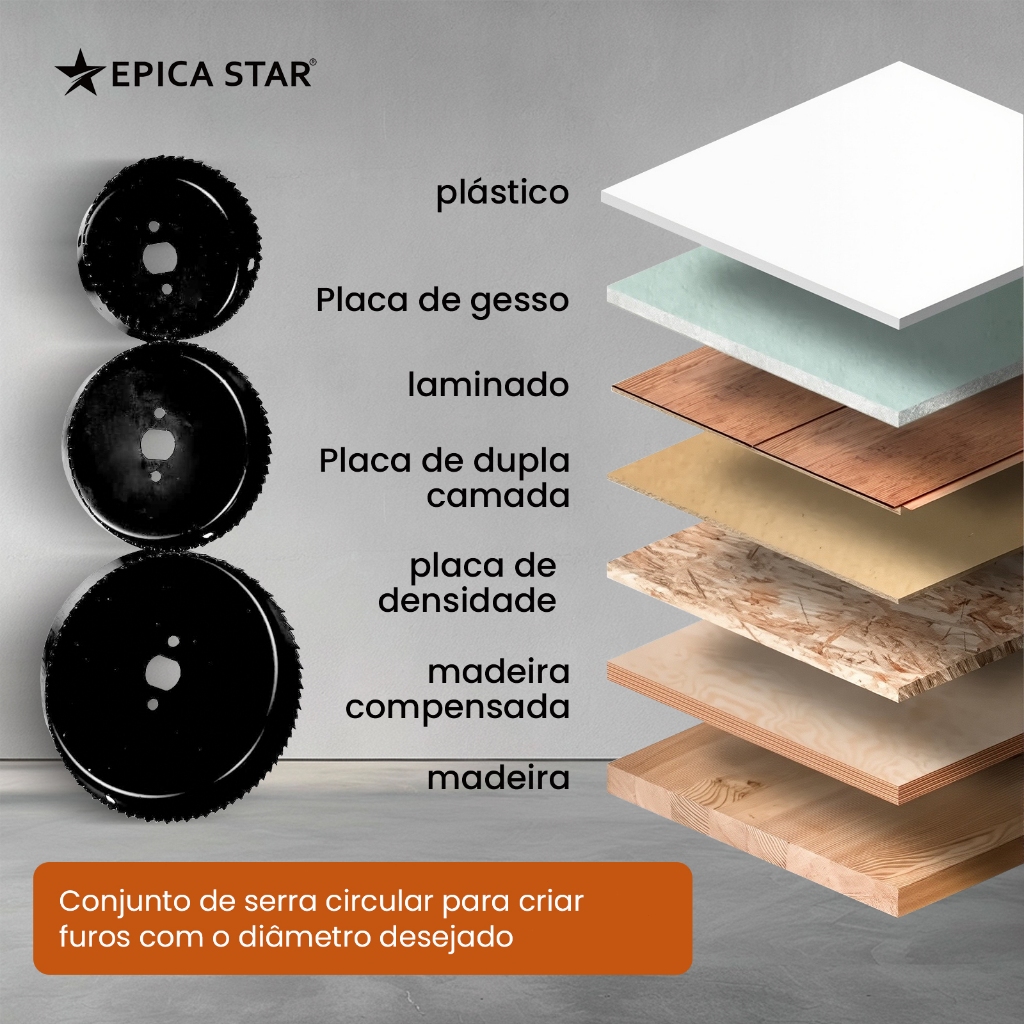 Descrição: O conjunto de serra copo EPICA STAR® é a solução profissional para cortes precisos em madeira, plástico, drywall, laminados e compensados. Desenvolvido em aço carbono com dentes de aço rápido, oferece durabilidade e resistência ao desgaste. Perfeito para uso com furadeiras, inclui acessórios completos para maior praticidade. Parâmetros: Conjunto com 16 peças Diâmetros: 19mm (3/4"), 22mm (7/8"), 28mm (11/8"), 32mm (11/4"), 38mm (11/2"), 44mm (13/4"), 51mm (2"), 64mm (21/2"), 76mm (3"), 89mm (31/2"), 102mm (4"), 127mm (5") Material: Aço carbono Especificações Técnicas: Dentes em aço rápido para corte suave Design de encaixe progressivo Resistente a impactos Compatível com furadeiras elétricas Cenários de Uso: Instalação de tomadas e interruptores Corte de rodapés e tubos Trabalhos em madeira compensada Instalações em placas de gesso e laminados Conteúdo da Embalagem: 16 Serras copo Broca de localização Chave sextavada Mandril Placa de montagem Maleta organizadora