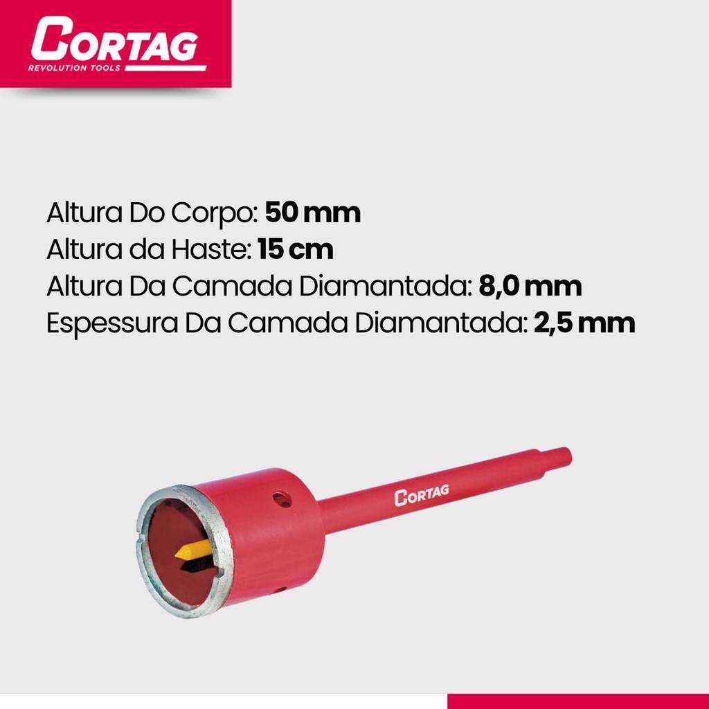 Serra Copo- Alvenaria 50 mm ..................................................................................................................................... INFORMAÇÕES SOBRE O PRODUTO ..................................................................................................................................... A Serra Copo Alvenaria é especialmente indicada para furar: Paredes de alvenaria, Blocos de cimento, Pisos e revestimentos cerâmicos, Pedras decorativas, Telhas, Tijolos e materiais similares. ..................................................................................................................................... ESPECIFICAÇÕES DO PRODUTO ..................................................................................................................................... Diâmetro: 45 mm Altura da camada diamantada: 8 mm Espessura da camada diamantada: 2,5 mm Rosca de encaixe da serra copo: M 12 Rosca do pino guia: M6 Comprimento útil da haste: 150 mm Encaixe da haste: Ø 10 mm ..................................................................................................................................... OUTROS ..................................................................................................................................... Material da Lâmina: O corte é feito com diamante sinterizado, que é extremamente resistente e eficiente para cortar materiais duros e abrasivos, como alvenaria, concreto e cerâmica. * Haste e Pino Guia: A serra copo possui haste para ser encaixada em furadeiras e pino guia, que ajuda a manter a ferramenta estável durante o corte, garantindo precisão e evitando que a serra saia da posição correta. * Aplicação: Ideal para furos em alvenaria, cerâmica, granito e concreto. Muito útil em trabalhos de instalação de tomadas, interruptores, ou passagem de cabos elétricos em paredes de tijolos ou concreto. * Eficiência: A serra copo diamantada tem alta durabilidade e eficiência no corte, proporcionando uma excelente performance em comparação com outros tipos de lâminas, como as de aço. * Durabilidade: O revestimento de diamante garante uma vida útil prolongada, mesmo em condições de uso intensivo. * Vantagens: Corte mais rápido e preciso: O uso de diamante permite que a ferramenta corte com mais rapidez e precisão do que outras serras copo. * Durabilidade: O material diamantado é muito resistente ao desgaste, o que resulta em uma ferramenta que dura mais. * Versatilidade: A serra copo pode ser utilizada para uma variedade de materiais, sendo muito útil para profissionais de construção e reformas. ..................................................................................................................................... DÚVIDAS FREQUENTES ..................................................................................................................................... Pergunta: Como é embalado o produto? Resposta: Todos os nossos produtos vendidos são embalados em caixas lacradas ou plástico stretch. Em respeito ao meio ambiente 90% das caixas são reutilizadas. Pergunta: Quem faz a entrega? Resposta: A entrega é terceirizada, feita via CORREIOS ou TRANSPORTADORA. Pergunta: O envio é feito em quantos dias? Resposta: Nós enviamos o seu pedido no prazo máximo de 24 horas após a confirmação de sua compra, sendo um dos envios mais rápidos da plataforma. Pergunta: Os produtos são novos ou usados? Resposta: Todos os produtos que trabalhamos são novos e com qualidade garantida. .....................................................................................................................................