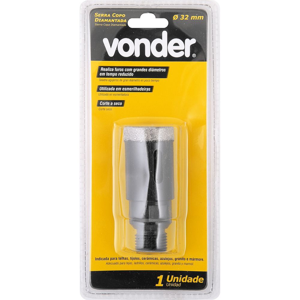 Ref. Fornecedor: 3617200032 Marca: Vonder Conteúdo Embalagem: 1 Serra copo Destaques e diferenciais: Corte a seco. Permite a realização de furos com grandes diâmetros em tempo reduzido Aplicações e dicas de uso: Serra copo diamantada para uso em telhas, tijolos, cerâmicas, azulejos, granito, mármore. Indicada para uso em esmerilhadeira com rosca interna M14 e rosca externa 1/2" BSP para máquinas estacionárias em marmoraria Características Técnicas: Diâmetro da serra copo: 32 mm Altura útil aproximada da serra copo: 47 mm Comprimento total: 80,0 Diâmetro e tipo da rosca: M14 Rotação máxima (rpm): 11000 /min