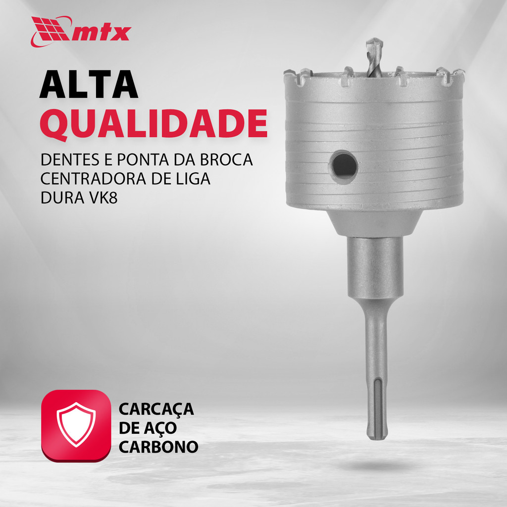 Serra Copo MTX 703319 – M22 x 80 mm | Para Perfuradores SDS PLUS | Perfuração Precisa em Concreto A Serra Copo MTX 703319 é o acessório ideal para quem precisa fazer furos precisos e rápidos em concreto, especialmente para instalações elétricas e hidráulicas, como tubulações, tomadas e interruptores. Características e Benefícios: Alta resistência: Corpo em aço carbono com dentes e broca centralizadora em liga dura VK8, garantindo durabilidade mesmo nos materiais mais duros. Remoção eficiente de resíduos: Canal espiral externo que elimina lama e detritos, facilitando o trabalho e prolongando a vida útil do perfurador. Perfuracão precisa: Broca centralizadora que evita deslizamento, garantindo furos exatos e acabamento profissional. Compatibilidade: Desenvolvida para perfuradores com mandril SDS PLUS. MTX 703319: Performance e precisão para obras, reformas e manutenções que exigem qualidade e agilidade. Adicione ao seu kit e faça furos perfeitos em concreto com facilidade!
