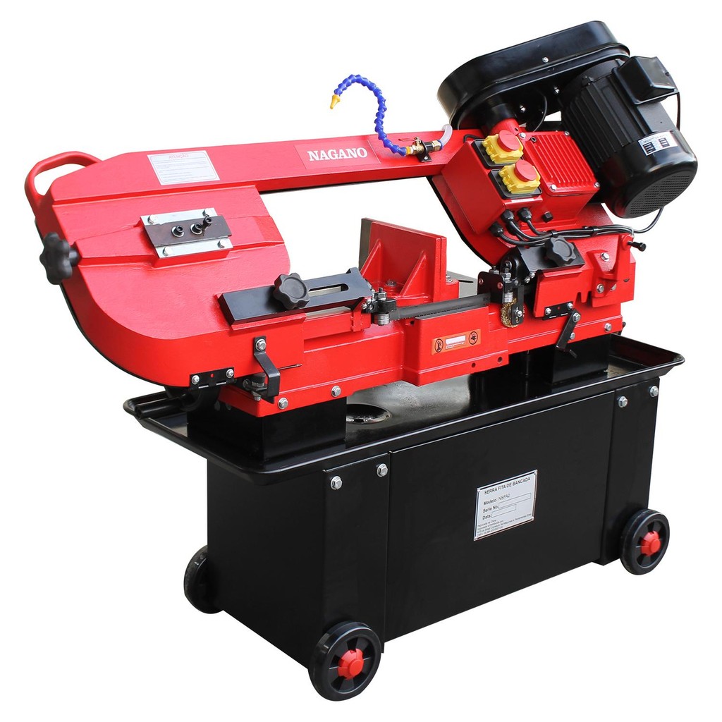 A Serra Fita de Bancada Horizontal é o maquinário ideal para realizar cortes precisos e com segurança em materiais muito espessos com grande dureza. A Fita de Serra realiza movimentos constantes em alta rotação para efetivar o corte dos materiais. A velocidade da fita de serra pode ser alterada com o deslocamento de uma correia em V para polias com diâmetros diferentes. Podem ser selecionadas velocidades que permitem uma ampla gama de materiais a serem serrados de acordo com a necessidade. Os mordentes da prensa de fixação podem ser ajustados em um campo de 45° a 90° para permitir serração angular. Um cilindro hidráulico com uma válvula de regulagem de avanço ajustável manualmente atua como o sistema de ajuste de avanço para o arco da serra. A tensão da lâmina de serra é regulada usando um manípulo. Equipada com guias da lâmina de serra com rolamentos e torno ajustável. Possui bomba de refrigeração, sistema de fluído refrigerante, sistema de lubrificação e botão de parada de emergência. Potência: 1,5hp 750 W Modelo: NSFA2 Frequência: 60 Hz Motor Trifásico Velocidade da Lâmina: 41, 49, 69, 120 m/min Tamanho da Lâmina: 2360 x 20 x 0,9 mm Corte 90º: 180 mm 180 x 300 mm Corte 45º: 110 mm 110 x 180 mm Altura da Bancada: 550 mm