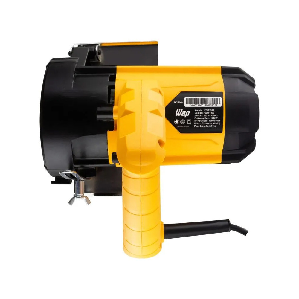 WAP Serra Mármore 4.3/8" ESM1300 com Regulagem de Altura e Interruptor Isolado, 100% Rolamentada, 1300W Solução profissional da linha WAP Ferramentas! Esta ferramenta da linha WAP Ferramentas opera com um motor de 1300W, que oferece toda a potência para realizar cortes retos com precisão e eficiência. Diferenciais do Produto Com motor de 1300W de potência, a serra mármore WAP ESM1300 encara variados materiais. Botão trava e regulagem de altura. Possui sistema rápido de trocas de escovas de carvão. Informações Técnicas: Cor: Amarelo com Preto Potência Elétrica: 1300W Voltagem: 127V ou 220V (Escolher, quando disponível) Frequência: 60 Hz Motor: Universal (Escovas de Carvão) Rotações: 12.000 rpm (min-1) Torque: 1,6 Nm Classe de Isolação: II Profundidade de Corte (Corte Reto): 90° - 34mm Aplicação: Pedras, Telhas, Cerâmica, Azulejos, Pisos e Outros Tipos de Materiais Diâmetro do Disco Ø : 4.3/8 Polegada (110mm) - Não Acompanha Disco de Corte Comprimento do Cabo Elétrico: 2 metros Regulagem de Altura: Sim Botão de Trava: Sim Sistema Rápido de Troca de Escova de Carvão: Sim Dimensões do Produto CxLxA: 22 x 21,5 x 17,5 cm Dimensões da Embalagem CxLxA: 22,5 x 22 x 18,5 cm Peso Aproximado: 2,6 Kg Garantia: 12 Meses SKU: MODELO: ESM1300 CÓDIGO WAP: FW007489 (127V) | FW007490 (220V)