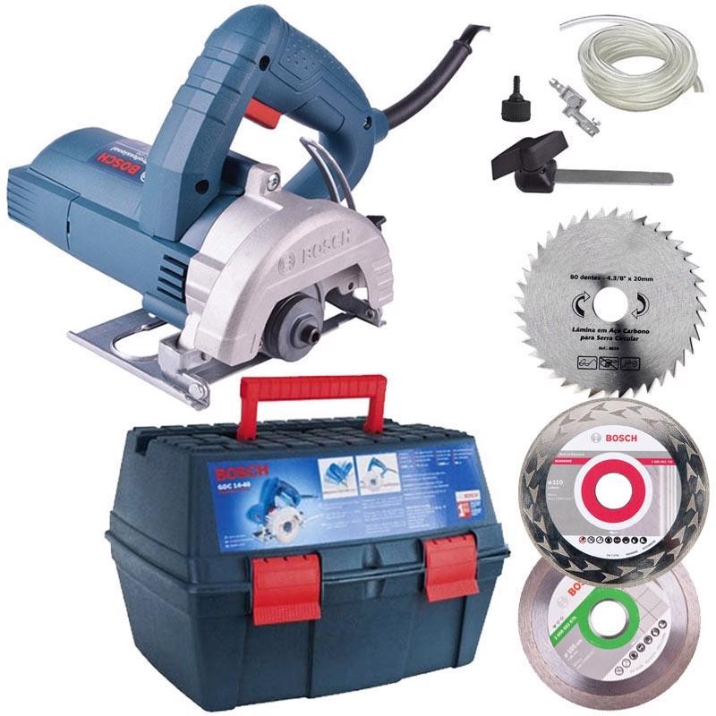 Serra Mármore Bosch TITAN 1.500W GDC 151 5 Pol c/ Maleta, Kit de Refrigeração BOSCH + 3 Discos (2 Diamantando + 1 para Madeira) Nova Serra Mármore Bosch TITAN GDC 151 Com Kit Refrigeração, Maleta e 1 Disco Para Cerâmica. É a melhor, mais potente, mais leve, com o maior alcance e capacidade de corte da categoria. Veio para revolucionar a categoria de serras mármore do mercado, e foi projetada exclusivamente para atender as necessidades dos usuários. A versão Titan GDC151 acompanha kit de refrigeração para cortes a úmido e chave exclusiva Bosch para troca rápida e simples de discos, com apenas uma mão. Oferece durabilidade, praticidade, conforto, segurança e alto desempenho. Ideal para marmorarias, construção civil em geral, pedreiros, azulejistas, encanadores, eletricistas e instaladores de cerâmica. BENEFÍCIOS: A serra mármore mais potente da categoria, com 1500W e 12.200 rotações por minuto. Força e velocidade no trabalho. A mais leve, pesando apenas 2,6 kg. Com design compacto e ergonômico. Com o maior alcance, capacidade e profundidade de corte, corte reto de 90° ou em ângulo de 45°. Placa base com maior visibilidade de corte e alcance (até a parede). Placa base patenteada pela Bosch, menor que os modelos antigos e da concorrência. Vai onde as outras não vão! Com gatilho grande para dois dedos (não permite o acionamento involuntário) e empunhadura com Soft Grip, oferecendo maior controle, conforto e segurança. Troca de disco simples e rápida! Patente exclusiva Bosch. Chave única e exclusiva para troca rápida de discos. Possibilita trocar discos com apenas uma mão e uma chave. APLICAÇÕES: Cortes retos, curvos e em ângulos. Cortes de pisos e revestimentos, lajotas, tijolos, telhas, mármore e granito em geral. Cortes de pias, rodapés, soleiras e corrimãos. Cortes de paredes (Tijolos, Alvenaria etc.) para instalação de conduíte e tubulação de água. Corte em madeira. DADOS TÉCNICOS: Tensão: 110V ou 220V (não bivolt). Potência: 1.500 W. Rotação: 12.200 rpm. Capacidade Máxima de corte: 90º - 40,3 mm / 45º - 26 mm. Capacidade máxima de disco: 125 mm. Capacidade mínima de disco: 105 mm. Peso: 2,6 kg. CONTÉM: 2 Discos de corte liso para cerâmica seco/úmido. Kit água (refrigeração) para cortes a úmido. Chave exclusiva Bosch para troca de discos. Maleta para armazenamento e transporte. 1 disco para Madeira. *Imagens meramente ilustrativas.