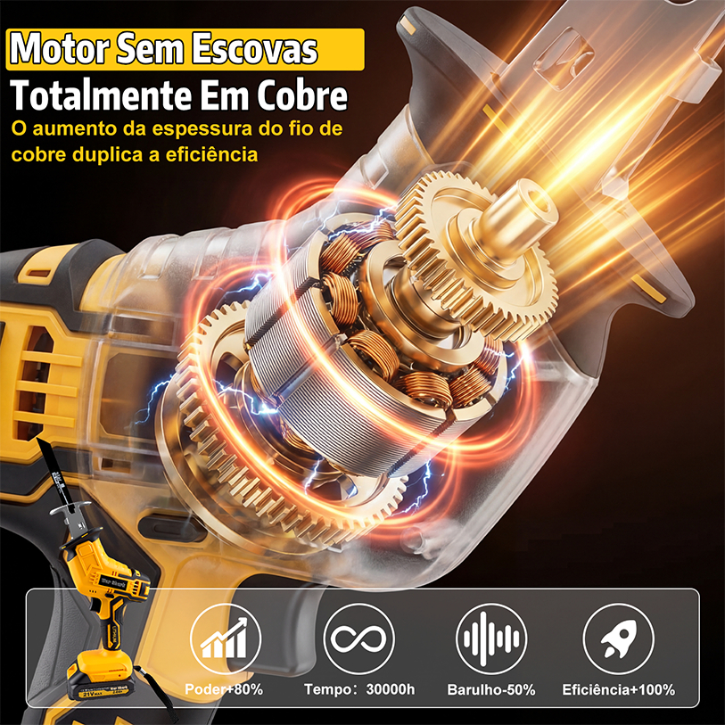 Cada um dos nossos produtos foi submetido a uma inspeção de qualidade especial (teste de alta temperatura e umidade e teste de queda de altura) antes de sair da fábrica. Eles são todos produtos de alta qualidade, sinta-se à vontade para comprá-los. Se você não estiver satisfeito com algum de nossos produtos ou tiver alguma dúvida durante o uso, entre em contato conosco primeiro. Obrigado pelo seu apoio e confiança em nossa loja.Fabricadas com lâminas de serra óssea de aço inoxidável com tratamento especial,lâminas são resistentes,duráveis e resistentes à quebra, garantindo um uso mais seguro e confiável. Motor potente sem escovas: Esta serra tico-tico está equipada com um motor sem escovas de alta eficiência, aumentando a potência em 80% e a eficiência em 100%, resultando em cortes estáveis e potentes. Opera com baixo ruído, baixa vibração e baixa temperatura, permitindo operação contínua por longos períodos. A estrutura sem escovas reduz o desgaste, elimina a poeira de carbono, dispensa manutenção e estende a vida útil para 30.000 horas, tornando toda a máquina mais durável e confiável. Bateria de longa duração para projetos prolongados: Com 2 baterias de 2,0 Ah, você desfrutará de maior tempo de uso. O recurso de carregamento rápido significa que você estará sempre pronto para usar, minimizando o tempo de inatividade. Esta serra sabre sem fio garante que você possa concluir seus projetos sem interrupções. Versátil para todos os materiais: Equipada com 5 lâminas de serra de alta qualidade, nossa serra sabre lida com diversos materiais com facilidade. O comprimento do curso de 15 mm garante cortes precisos, tornando esta serra sabre elétrica uma ferramenta versátil para qualquer tarefa de corte, desde a poda de galhos até o corte de tubos de metal. Operação confortável com uma só mão: Esta serra sabre sem fio e leve foi projetada para uso prolongado e sem esforço. Perfeita para usuários de todos os gêneros, é a escolha ideal para quem busca facilidade e precisão em seu trabalho. Troca de lâminas rápida e fácil: Cansado de se atrapalhar com ferramentas? A troca de lâmina sem ferramentas da serra sabre permite que você troque as lâminas em segundos, garantindo que você nunca perca o ritmo. Esse recurso de troca de lâmina sem ferramentas torna a serra sabre elétrica perfeita para quem valoriza eficiência e praticidade em seus projetos. Equipada com luz de trabalho LED integrada: Esta serra sabre ilumina áreas de trabalho escuras (como embaixo de móveis, dentro de armários ou porões pouco iluminados) para maior visibilidade, garantindo cortes precisos mesmo em condições de baixa luminosidade, tornando seus projetos mais seguros e eficientes. Desempenho potente para todas as tarefas: Imagine cortar madeira, canos e metais sem esforço com nosso motor sem escovas e velocidade de 0 a 3500 RPM. Seja para um projeto de reforma doméstica ou um trabalho profissional, esta serra sabre sem escovas oferece a potência necessária. É a sua serra sabre sem fio definitiva para todas as suas necessidades de corte. Botão de trava de segurança para uso seguro: Possui um botão de trava integrado que impede a ativação acidental, aumentando a segurança operacional, especialmente durante o armazenamento, transporte ou manuseio da lâmina de serra. Isso garante tranquilidade tanto para usuários iniciantes quanto experientes. Ficha Técnica: - Motor: Motor sem escovas totalmente em cobre - Capacidade de Corte em Plástico: 195mm - Capacidade de Corte em Madeira: 195mm - Capacidade de Corte em Aço: 5mm - Nível de Potência Sonora (LwA): 107dB(A) - Nível de Pressão Sonora (LpA): 106dB(A) - Velocidade Sem Carga: 0-3200 RPM - Comprimento da Serra: 19,5cm - Curso da Serra: 20mm - Vibração: 6,59m/s² - Potência: 1500W- Tipo de Bateria:*Lítio - Tensão de Carregamento (V): 110-220 - Tensão das Baterias : 21V cada - Capacidade de Carga: 2000mA Itens inclusos: Serra sabre x 1 Baterias recarregáveis bivolt x 2 Maleta de transporte x 1 6 TPI Serra para madeira x 2 10 TPI Serra para madeira x 1 18 TPI Lâmina de serra para metal x 1 Cabeça de serra em aço inoxidável x 1