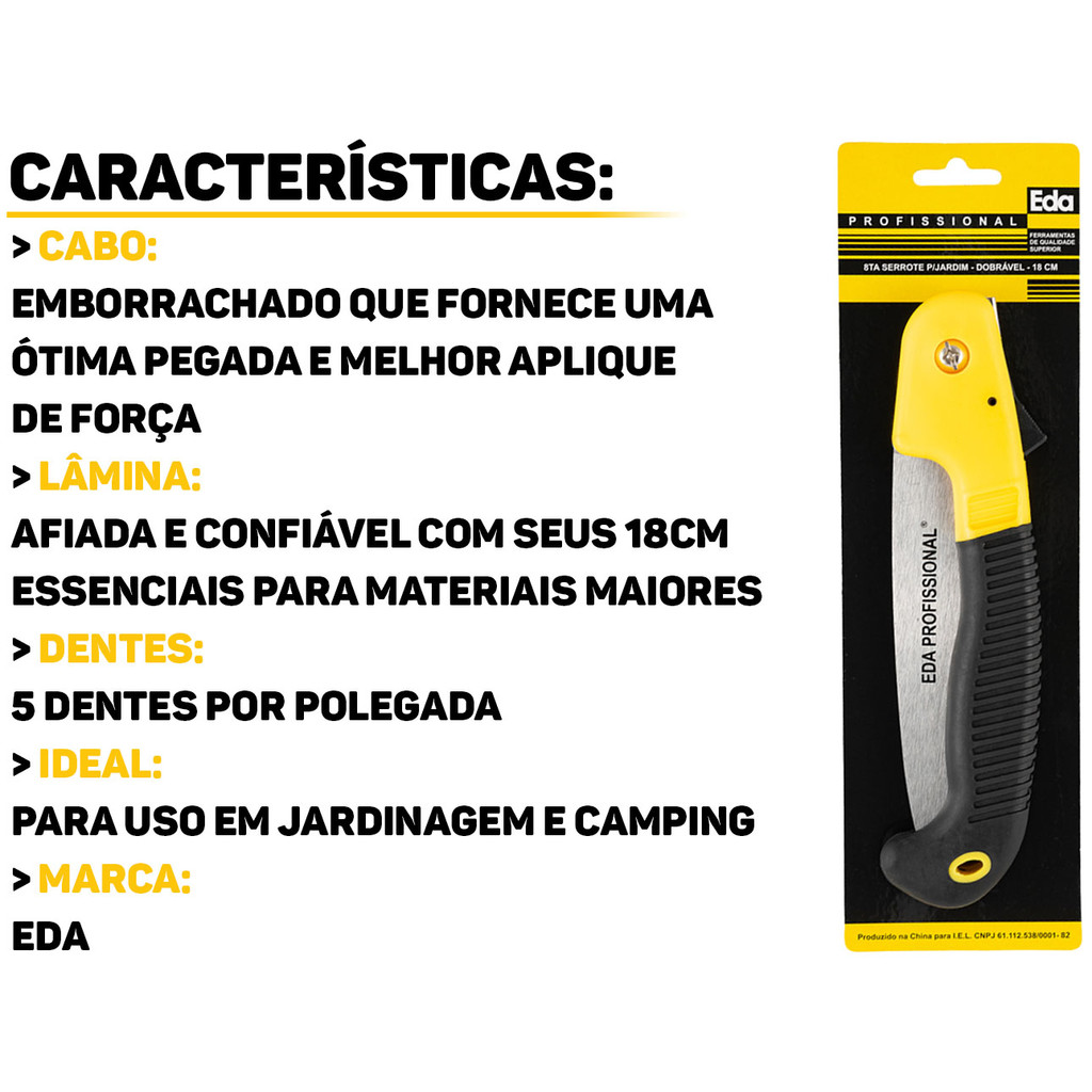Serrote Dobrável Para Jardim Eda O Serrote da marca Eda é ideal para cortes em madeira, galhos e folhagens, tornando-o uma ferramenta indispensável para o uso em seu jardim. É compacto e fácil de manusear, além de ser dobrável para facilitar seu armazenamento. O cabo é produzido em plástico resistente, garantindo aderência segura e confortável durante o uso. Características: > Cabo emborrachado; > Corte rápido e preciso; > Uso doméstico e profissional; > Ideal para uso em jardinagem e camping. Especificações Técnicas: > Comprimento: 18cm; > Material: aço e cabo emborrachado. - Marca: Eda - Garantia: 90 dias contra defeitos de fabricação Vantagens de comprar na Brester: - Produto a pronta entrega. - Produto novo, com garantia de fábrica. - Nota fiscal para Pessoa Física e Pessoa Jurídica.