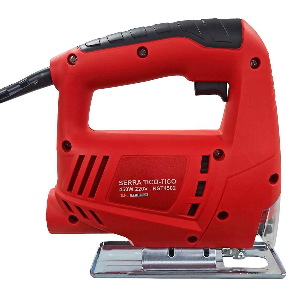 A Serra Tico-Tico Elétrica Nagano 450 W (Modelo NST4501) é a parceira certa para quem precisa de versatilidade, precisão e segurança em cortes retos e curvos. Compacta e fácil de manusear, trabalha com madeira, MDF, compensado, plástico, alumínio e chapas finas de metal — ideal para marceneiros, montadores de móveis, artesãos e times de manutenção. Com motor de 450 W, velocidade variável (até 3.000 rpm) e base inclinável até 45°, adapta-se ao material e à espessura para entregar cortes limpos e bem acabados. O sistema de troca rápida de lâmina, sem ferramentas, acelera o setup e mantém a produtividade em alta. Por que escolher a NST4501? Versátil: atende diferentes materiais com velocidade variável. Precisa: base ajustável até 45° para cortes em ângulo. Rápida de ajustar: troca de lâmina sem ferramentas. Confortável e segura: empunhadura ergonômica, guarda de proteção e excelente controle. Principais aplicações Cortes retos e curvos em madeira, MDF e compensado Corte de chapas finas de metal e alumínio Recortes decorativos e encaixes para marcenaria e artesa