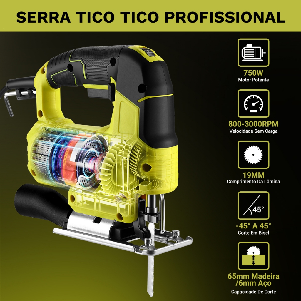 Serra Tico Tico Elétrica 750W 3000RPM Profissional 6 Velocidades Para Madeira Metal 127V Desoon
