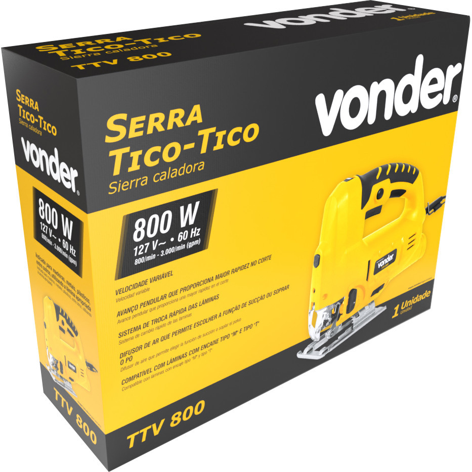 Serra tico-tico TTV 800 127 V~ VONDER Possui avanço pendular que proporciona maior rapidez no corte, sistema de troca rápida das lâminas, não sendo necessário o uso de chave para troca, difusor de ar que permite escolher a função de sucção ou soprar o pó, além de cabo com revestimento emborrachado, conferindo maior conforto no manuseio. Conta ainda com dupla isolação, garantindo mais segurança ao operador. Indicada para madeiras, metais, plásticos, entre outros, utilizando a lâmina apropriada. Especificações: Modelo: TTV 800 Potência: 800 W Tipo de encaixe da lâmina da serra tico-tico: Tipo "M" e tipo "T" Tipo de velocidade: Variável Capacidade de corte em aço 90º: 10 mm Capacidade de corte em alumínio 90º: 12 mm Capacidade de corte em madeira 90°: 80 mm Ângulo de inclinação da base: 45º Número de golpes por minuto (gpm): 800/min - 3.000/min Tensão (V): 127 V~ Frequência (Hz): 60 Hz Segue norma: ABNT NBR IEC 60745-1 e ABNT NBR IEC 60745-2-11 Massa aproximada (peso) (kg): 2.8 kg Aceleração transmitida nas mãos - braços do operador - ah: Em madeira: 6,41 m/s² - Em metal: 10,55 m/s² Incerteza da aceleração transmitida nas mãos - braços do operador - k: 1,5 m/s² Conteúdo da Embalagem: 1 Serra tico-tico. Acompanha: 1 guia de corte lateral, 1 lâmina 50 mm para madeira encaixe tipo "T" e 1 chave allen 3 mm.