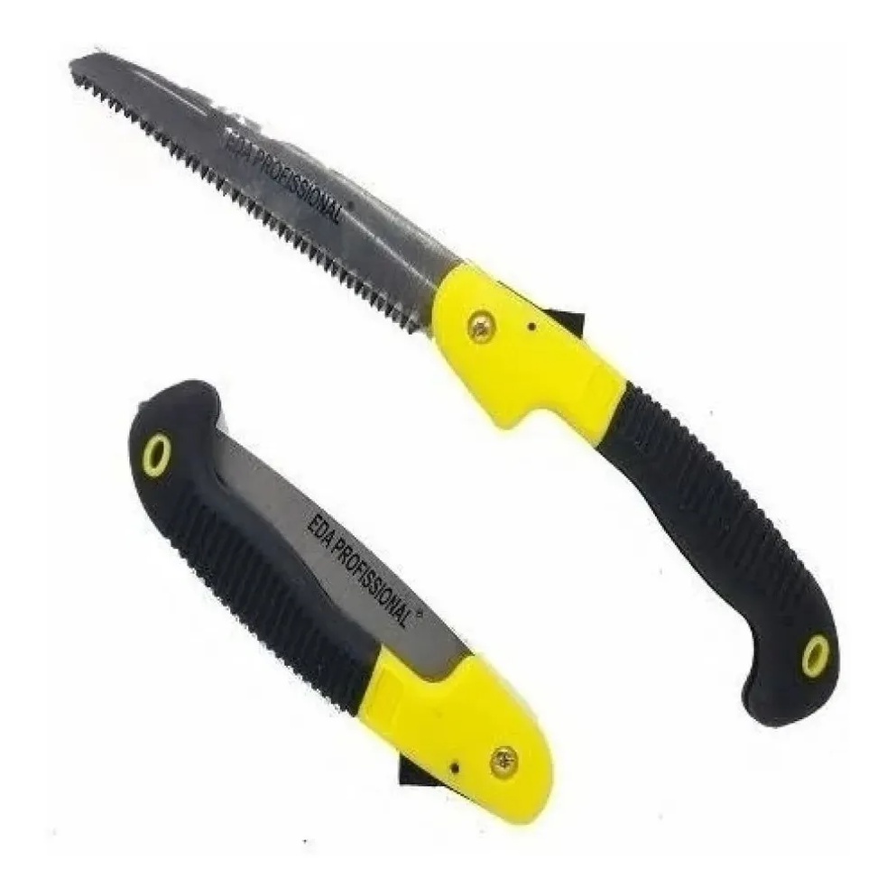 Serrote Dobrável Portátil Camping Poda Emborrachado EDA 8TA. O Serrote Dobrável Portátil é o serrote ideal para quem deseja praticidade e alta qualidade. Possui lâmina cromada de aço temperado, proporcionando segurança e excelente fio de corte possibilitando um corte limpo e preciso. Sua lâmina possui forma cônica, impedindo que ocorra travamento. Além disto, os dentes da serra são ordenados em disposição, impedindo que permaneçam sujos de resíduos após o corte. O Serrote Dobrável Portátil possui cabo emborrachado, facilitando no corte e disponibilizando total conforto e segurança no manuseio. Qualidade e Segurança Superior O Serrote Dobrável Portátil possui trava de segurança e tratamento térmico na ponta dos dentes do serrote, proporcionando total segurança no uso diário. Produto extremamente versátil, podendo ser utilizado para diversos usos, como praias, campings, jardins, uso doméstico, no corte de galhos, corte de troncos, corte de cordas, corte de canos pvc, podas de árvores e muito mais. Características Técnicas Marca: EDA. Modelo: 8TA. Material da Serra: Aço Temperado Cromado. Com Cabo Emborrachado. Tipo de Serrote: Costilla. Dentes por Polegada: 5 Dentes. Os objetos que ambientam as imagens não acompanham o produto. As cores dos objetos podem sofrer alterações devido a luminosidade, configurações do monitor e até mesmo a percepção do usuário. Pesos e Medidas Peso total aproximado: 250g. Comprimento total aberto: ~40cm. Comprimento total fechado: ~23cm. Comprimento total serra: ~18cm. Itens Inclusos 1 Un. Serrote Dobrável EDA 8TA.