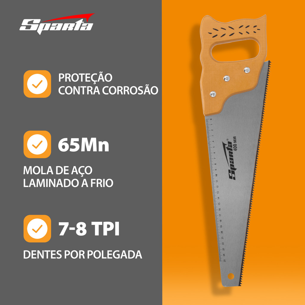 Serra Manual Sparta 2318555 – 400 mm | Potência, Precisão e Durabilidade para Cortes em Madeira A Serra Sparta 2318555 é uma ferramenta robusta e eficiente, ideal para cortes longitudinais e transversais em madeira. Com lâmina de 400 mm em aço de mola 65Mn e dentes grandes com afiação dupla, garante cortes rápidos, precisos e com menos esforço. Indicada para carpintaria, marcenaria e uso geral, combina resistência, praticidade e longa vida útil. Conta ainda com dentes temperados, escala de medição integrada, revestimento protetor anticorrosivo e cabo de madeira envernizado, oferecendo conforto e segurança durante o uso. Destaques do Produto: Lâmina de 400 mm em aço de mola 65Mn – resistente a quebras e deformações. Afiação de dois lados e dentes grandes (7–8 TPI) – cortes rápidos em ambas as direções. Dentes temperados (55 HRC) – durabilidade e manutenção mínima. Escala de medição integrada – agilidade no trabalho. Revestimento protetor contra corrosão – mais longevidade. Cabo de madeira envernizada com fixação por parafusos – firmeza e conforto. Com excelente custo-benefício, a Serra Sparta 2318555 é uma escolha inteligente para quem busca uma ferramenta durável, funcional e pronta para encarar os mais diversos desafios em madeira. Ideal para profissionais e usuários exigentes, ela entrega desempenho e confiabilidade em cada corte.