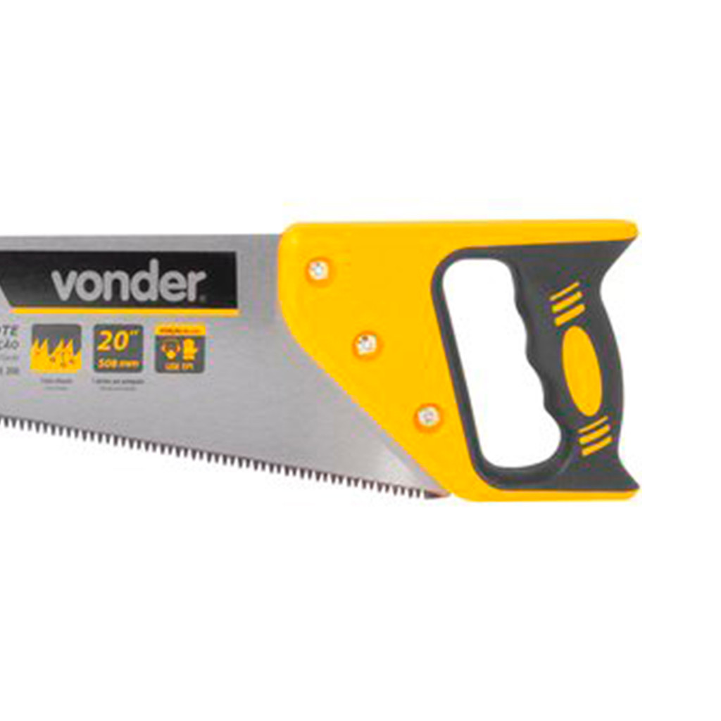 Serrote Profissional 20" 500mm Vonder SE200 32 91 100 200 Indicado para cortes em madeira. Possui dentes travados com tripla afiação, conferindo um corte mais rápido. Material da lâmina do serrote: Aço carbono Material do cabo do serrote: Plástico e borracha Comprimento de corte do serrote: 20" - 508 mm Número de dentes por polegada: 7 dentes Imagens meramente ilustrativas