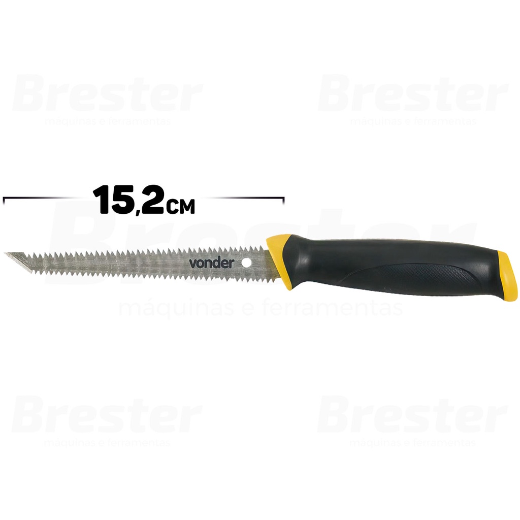 Olá, Bem vindo a Distribuidora Brester. Trabalhamos com uma grande variedade de ferramentas elétricas e manuais, descartáveis, eletroeletrônicos, artigos para casa, artigos de petshop e outros. Aqui você encontrará Produtos Originais, Nota Fiscal, Pronta Entrega e Envio Imediato! * Características do produto * Serrote Profissional Drywall Gesso Lâmina Dupla 6 Polegadas Você precisa de um serrote para cortar drywall? A Vonder tem o que você precisa. O Serrote 6" Para Drywall é a ferramenta ideal para cortes precisos e limpos. Seu cabo ergonômico de plástico rígido recoberto com borracha termoplástica garante maior conforto e segurança no manuseio. Com ponta afiada para furo inicial, dupla linha de corte e dentes travados com precisão, o Serrote 6" Para Drywall da Vonder é a escolha certa para você. Sua versatilidade e resistência nos materiais tornam esse produto ainda mais necessário para realizar seus trabalhos de maneira ágil e segura. Aproveite essa chance de adquirir agora mesmo o Serrote 6" Para Drywall da Vonder. A qualidade, resistência e versatilidade que você precisa para realizar seus trabalhos de maneira precisa e segura. Garanta já o seu e torne seus projetos ainda mais incríveis! Características Técnicas: > Material da lâmina do serrote: Aço temperado; > Material do cabo do serrote: Plástico rígido ABS; > Comprimento de corte do serrote: 6" - 152 mm; > Número de dentes por polegada: 9 dentes; > Massa aproximada (peso): 0,180 kg; - Marca: Vonder - Garantia: 90 dias contra defeitos de fabricação Vantagens: - Nota fiscal para Pessoa Física e Pessoa Jurídica. - Produto novo, com garantia de fábrica. - Produto a pronta entrega. - Envio em até 24hs em dias úteis após confirmação do pagamento. Obrigado por escolher a Brester Máquinas.