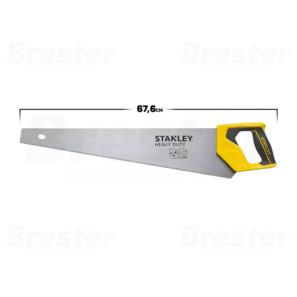 Serrote Heavy Duty Bimaterial 22 Polegadas Stanley O Serrote 22 Polegadas da Stanley oferece tripla afiação e permite cortes precisos e maior tempo de uso. Possui empunhadura ergonômica bimaterial, com ângulo de 45° para medição rápida. Ideal para quem busca maior desempenho, precisão, resistência e qualidade. Características: > Tripla afiação; > Alta resistência e qualidade; > 22 polegadas e ângulo de 45°; > Empunhadura ergonômica bimaterial; > Ideal para marceneiros, carpinteiros, artesãos e demais profissionais que necessitam realizar cortes em madeira ou laminados. Especificações Técnicas: > Material: aço; > Dentes por polegada: 8-9; > Comprimento da lâmina: 22 polegadas; > Dimensões aproximadas (C x L x A): 70cm x 17cm x 4,0cm. - Marca: Stanley - Garantia: 90 dias contra defeitos de fabricação Vantagens de comprar na Brester: - Produto a pronta entrega. - Produto novo, com garantia de fábrica. - Nota fiscal para Pessoa Física e Pessoa Jurídica.