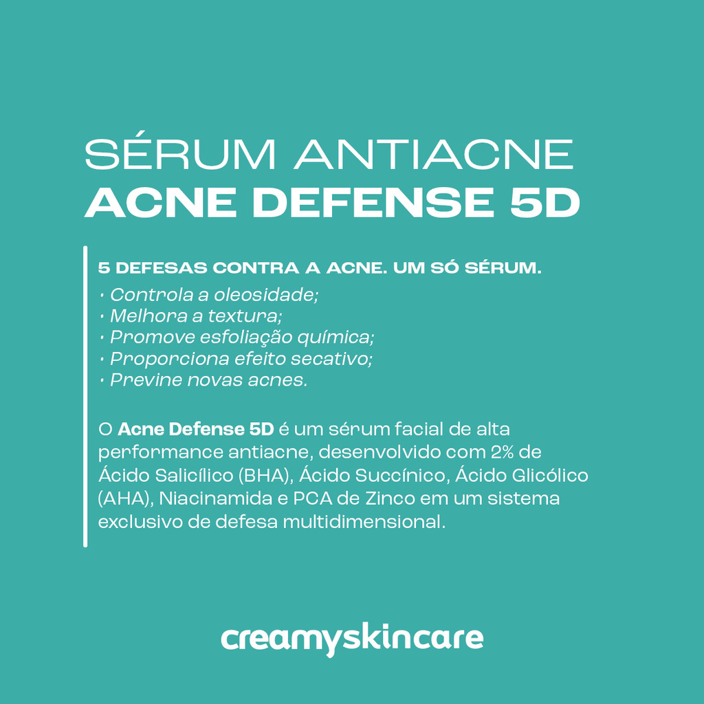 O Acne Defense 5D é um sérum facial de alta performance antiacne, desenvolvido com 2% de Ácido Salicílico (BHA), Ácido Succínico, Ácido Glicólico (AHA), Niacinamida e PCA de Zinco em um sistema exclusivo de defesa multidimensional. Enquanto o BHA penetra profundamente nos poros para desobstruí-los e ajudar a reduzir cravos e espinhas, o Ácido Succínico atua na microbiota da pele, contribuindo para uma pele mais equilibrada e menos propensa à inflamação. Em sinergia, o Ácido Glicólico promove esfoliação química suave, a Niacinamida fortalece a barreira cutânea e o PCA de Zinco auxilia no controle da oleosidade. O resultado é um cuidado intensivo que atua em cinco frentes: Ação antiacne, melhora da textura, esfoliação química, efeito secativo e prevenção de novas lesões. Principais benefícios Reduz cravos e espinhas; Ajuda a controlar a acne e tem efeito secativo; Diminui a aparência de poros dilatados; Renova, esfolia e normaliza a espessura da pele; Controla o brilho e a oleosidade excessiva ao longo do dia; Contribui para prevenir manchas. Como usar: Aplique o Acne Defense 5D sobre a pele limpa e completamente seca, evitando a área dos olhos, cantos do nariz e da boca. Primeira semana: Use uma vez ao dia, sempre à noite, em dias alternados, para avaliar a tolerância da pele. A partir da segunda semana: Se a pele estiver confortável, você pode evoluir o uso para todos os dias. Finalize com hidratante adequado para pele oleosa/acneica e, pela manhã, use sempre protetor solar de amplo espectro. Caso note ressecamento ou sensibilidade, reduza a frequência de uso e consulte seu dermatologista.
