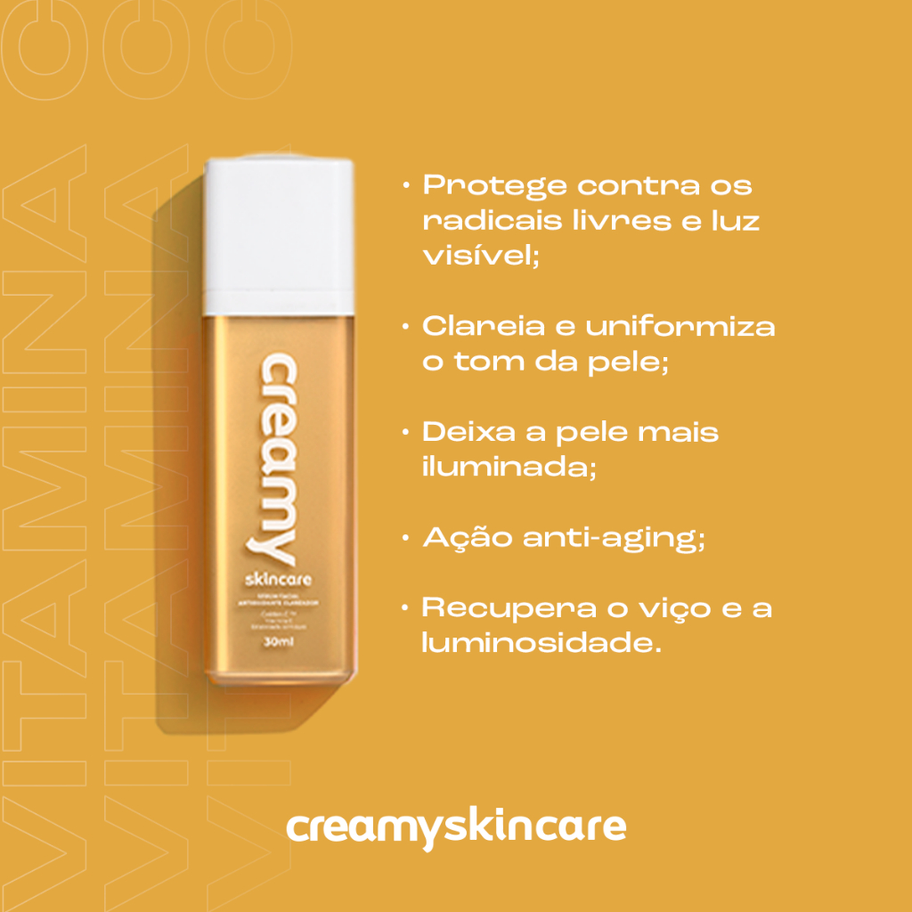 O que é? A Vitamina C Gold da Creamy traz a tecnologia da vitamina C pura estabilizada com moléculas de ouro. Um sérum antioxidante e clareador que combina ingredientes exclusivos: Duas formas de Vitamina C (pura e lipossolúvel) além de ingredientes clareadores exclusivos, sendo o sérum ideal para proteção da pele contra os radicais livres e efeito uniformizador do tom, amenizando manchas e atenuando marcas escurecidas. Esse sérum combina a alta estabilidade da vitamina C pura associada ao ouro com a Vitamina C Lipossolúvel - a forma de vitamina C que é mais compatível com a pele que garante uma ação mais eficiente devido a uma melhor absorção e mais profunda. O exclusivo complexo clareador composto pelos ativos Hexylresorcinol e Illuminyl 388 potencializam a ação clareadora do produto, atenuando áreas escurecidas e uniformizando o tom da pele. Possui textura sérum de rápida absorção, pode ser usado diariamente antes do protetor solar por todos os tipos de pele.