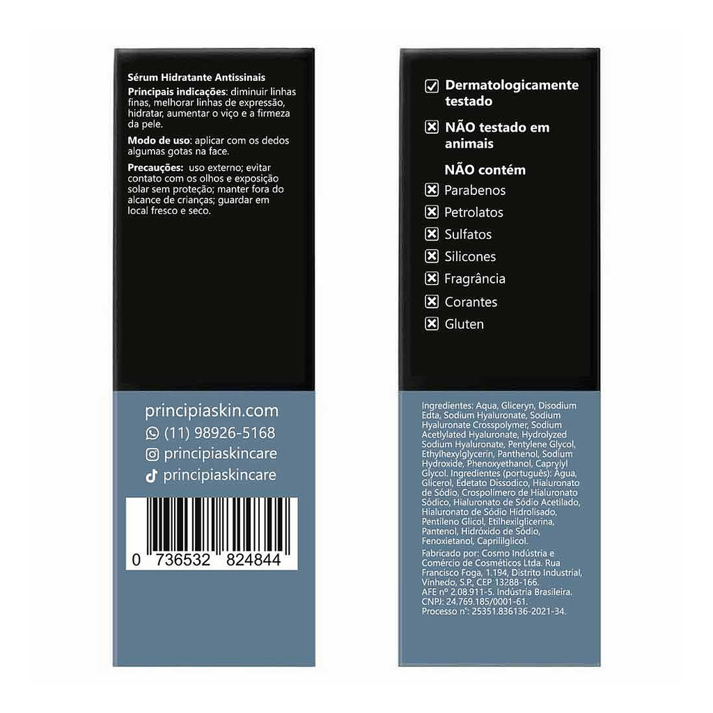Sérum Antissinais Principia AH-2 30ml Sérum facial para todos os tipos de pele. Principia AH-2 promove mais firmeza e hidratação, com menos rugas e linhas finas. O Sérum Facial Principia AH-2 apresenta uma formulação avançada com 2% de Ácido Hialurônico e Vitamina B5, ideal para combater os sinais de envelhecimento da pele. Seus ativos proporcionam uma face mais elástica, uniforme e radiante, além de diminuir olheiras e bolsas sob os olhos. Também confere uma sensação de maciez e suavidade à pele, melhorando o viço. INGREDIENTES ATIVOS Ácido Hialurônico: Presente naturalmente na pele, tem alta capacidade de atrair e reter líquidos. Existem vários tipos de Ácidos Hialurônicos, com pesos moleculares, propriedade e finalidades distintas. Enquanto as moléculas maiores formam filme na superfície; as menores conseguem penetrar em camadas mais profundas da pele, formando uma rede tridimensional que repõe Água do exterior e retém líquidos no interior, promovendo hidratação e aumentando a elasticidade, firmeza e o viço da pele. Vitamina B5: Substância de origem natural que proporciona diversos benefícios, como o aumento da hidratação superficial, elasticidade e maciez da pele, além de apresentar propriedades anti-inflamatórias. Pele rejuvenescida, com aparência saudável e bem cuidada. MODO DE USO Com o rosto limpo e seco e sem encostar a cânula na pele, aplique algumas gotas do produto no rosto e espalhe o seu conteúdo suavemente, inclusive na área dos olhos. Nossos Experts Ensinam Use antes de cremes, protetor solar e maquiagem. Aplique diariamente de manhã e à noite.