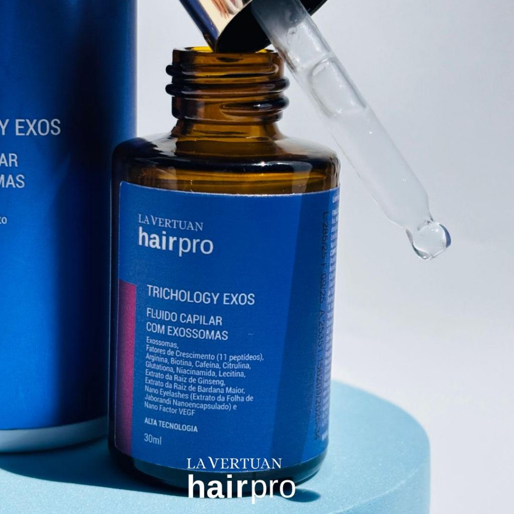 O poder da biotecnologia regenerativa para os tratamentos capilares profissionais. Estimula o crescimento dos fios, reduz a queda, minimiza falhas dos cabelos, traz saúde para o couro cabeludo e deixa os cabelos visivelmente mais fortes desde a raiz. O Fluido Capilar com Exossomas é um tratamento avançado para o crescimento e fortalecimento dos fios. Sua fórmula exclusiva com Exossomas, Fatores de Crescimento (11 peptídeos) e ativos como Arginina, Cafeína e Biotina revitaliza o couro cabeludo e estimula o crescimento saudável. O extrato de Ginseng e Bardana melhora a circulação, enquanto Nano Eyelashes e Nano Factor VEGF intensificam a ação regeneradora. Resultados visíveis em pouco tempo: cabelos mais fortes, densos e revitalizados. O que apenas o Fluido Capilar com Exossomas faz: - Estimula intensamente o crescimento dos fios - Fortalece e nutre o bulbo capilar - Reduz a queda e melhora a densidade dos cabelos - Revitaliza o couro cabeludo com ação regeneradora Aplicar no couro cabeludo (com o couro cabeludo previamente higienizado) e, depois, iniciar o procedimento de tricologia desejado. Não retirar o produto depois da aplicação. O Fluido Capilar com Exossomas possui uma combinação sinérgica de ativos que estimulam intensamente o crescimento dos fios, fortalecem o bulbo capilar, reduzem a queda e revitalizam o couro cabeludo com potente ação regeneradora. São eles: Exos Hair (Blend de: Exossomas, Arginina, Biotina, Cafeína, Citrulina, Glutationa, Lecitina, Niacinamida, Fatores de Crescimento - 11 peptídeos, Extrato da Raiz de Ginseng e Extrato da Raiz de Bardana Maior) (20mg/g; 2%) Nano Eyelashes (Extrato da Folha de Jaborandi Nanoencapsulado) (10mg/g; 1%) Nano Factor VEGF (5mg/g; 0,5%)