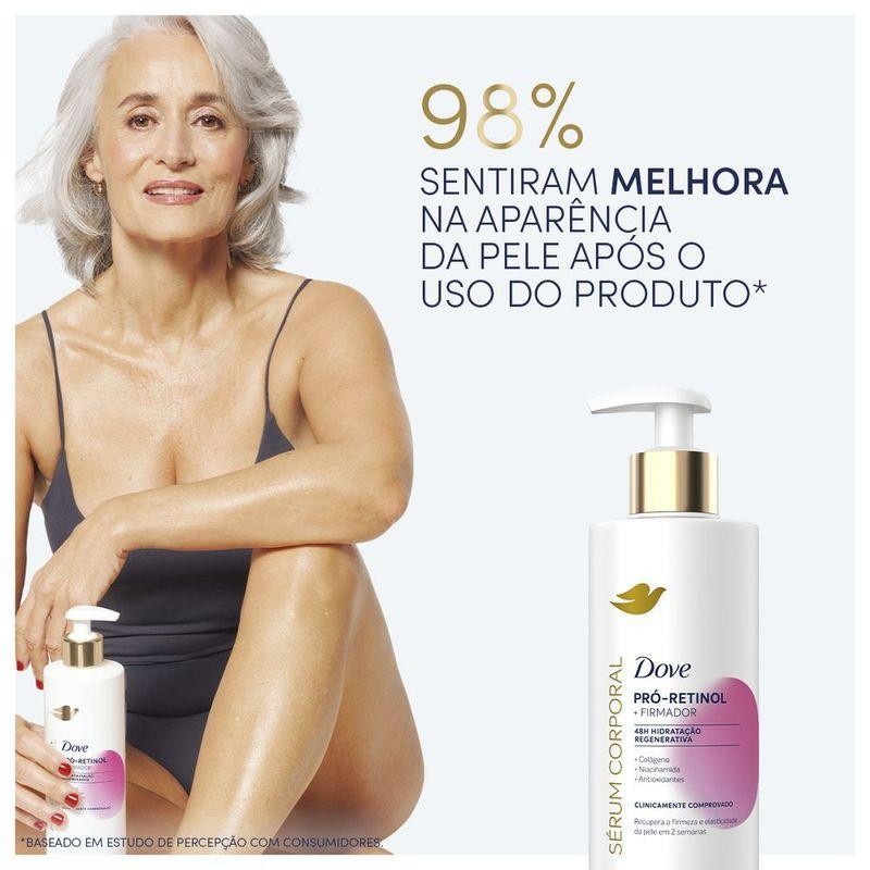 Sérum Dove Pró-Retinol + Firmador: Pele Mais Firme e Radiante em Apenas 2 Semanas O novo Dove Sérum Hidratante Corporal Pró-Retinol, com efeito firmador, vai além da hidratação ao estimular a regeneração da pele e restaurar sua luminosidade natural. Oferece 48h de hidratação regenerativa com ativos potentes, como Colágeno Vegano*, que promove firmeza e resistência; Niacinamida, que estimula a produção de colágeno e melhora a elasticidade; e Antioxidantes, que favorecem a renovação celular e fortalecem a barreira cutânea. Desenvolvido com dermatologistas e testado em mulheres reais, o hidratante Dove Pró-Retinol possui tecnologia exclusiva que hidrata profundamente e atua em sinergia com a pele, ajudando a restaurar sua firmeza e elasticidade natural de dentro para fora. Clinicamente comprovado: recupera a firmeza e elasticidade da pele. Com fórmula leve, não oleosa e de rápida absorção, é indicado para pele com flacidez e seca. Use diariamente em todo o corpo como alternativa ao hidratante tradicional para manter a pele hidratada, perfumada e com o microbioma equilibrado. Globalmente, Dove não realiza testes em animais. A linha de Séruns Deo Hidratantes Dove oferece ativos de alta potência para o cuidado que sua pele precisa. Dove. Cuide-se. Proteja-se. Pela beleza sem padrões. Colágeno de origem vegetal Tecnologia da Fórmula: Potência Firmadora para a Sua Pele -Hidratante corporal com pró-retinol e efeito firmador para pele seca e com flacidez -48h de hidratação regenerativa -Fórmula enriquecida com colágeno vegano*, niacinamida e antioxidantes -Estimula a regeneração da pele e restaura a luminosidade natural -Creme com textura leve, não oleosa, de rápida absorção e fácil aplicação Benefícios e Diferenciais - Aumenta a firmeza e elasticidade da pele - Resultados visíveis em até 2 semanas - 48h de hidratação regenerativa - Textura leve, de rápida absorção e não oleosa - Ideal para peles secas e com flacidez - Dermatologicamente testado e aprovado - Livre de testes em animais Perguntas Frequentes sobre o Sérum Dove Pró-Retinol 1. Para quem é indicado o Sérum Dove Pró-Retinol? É ideal para peles secas e com sinais de flacidez que buscam mais firmeza, hidratação e elasticidade. 2. Posso usar todos os dias? Sim! O uso diário potencializa os resultados e mantém a pele hidratada e firme por mais tempo. 3. Dove testa seus produtos em animais? Não. Dove é comprometida com a beleza sem crueldade e não realiza testes em animais. 4. Quanto tempo leva para ver os resultados? Os efeitos firmadores são clinicamente comprovados em até 2 semanas de uso contínuo. Descubra como sua pele pode ficar profundamente hidratada e renovada com Dove. Clique e compre agora na Drogal o Sérum Dove Pró-Retinol + Firmador, e experimente um cuidado avançado que restaura a maciez e luminosidade da sua pele seca e com sinais de flacidez.