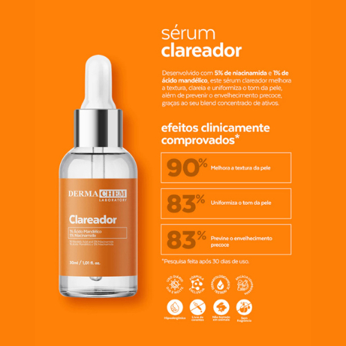 ✨ Pele mais uniforme e iluminada! O Sérum Efeito Clareador Dermachem foi desenvolvido para auxiliar na redução da aparência de manchas e na uniformização do tom da pele. Possui textura leve, rápida absorção e pode ser usado na rotina diária de cuidados. 💧 Benefícios: ✔ Auxilia na uniformização do tom da pele ✔ Contribui para suavizar a aparência de manchas ✔ Textura leve e não oleosa ✔ Fácil aplicação 📌 Modo de uso: Aplicar algumas gotas sobre a pele limpa e seca, espalhando até completa absorção. Pode ser utilizado diariamente. ⚠ Precauções: Uso externo. Evitar contato com os olhos. Em caso de irritação, suspender o uso. Recomenda-se o uso de PROTETOR SOLAR durante o dia. Em caso de dúvidas, consulte um dermatologista. 📦 Produto novo e bem embalado. 🚚 Envio rápido. MODO DE USO ROTINA DIURNA: 1º PASSO: Pela manhã, limpe bem o rosto com o sabonete. 2º PASSO: Aplique de 1-2 gotas do Sérum no rosto, pescoço e colo. Faça uma massagem com movimentos circulares para melhor absorção do produto. 3º PASSO: Aplique o protetor solar de sua preferência. 4º PASSO: Ao longo do dia repita esse cuidado. ROTINA NOTURNA: Á noite, com a pele limpa e seca aplique novamente o Sérum. Utilize o Sérum 3x ao dia. Não enxaguar. PRECAUÇÕES Evitar contato com os olhos. Em caso de contato com os olhos, lavar com água em abundância. Se houver irritação suspenda o uso. Mantenha o produto fora do alcance de crianças. Não ingerir. Uso externo. Não aplicar nas pálpebras, nos cantos externos do nariz e da boca e na pele irritada ou lesionada. Evitar exposição solar durante o uso do produto. Durante a primeira semana de uso, aplicar pequenas quantidades de produto, em dias alternados. Conservação: Conservar em temperatura ambiente. Proteger da luz, do calor e da umidade em excesso. Recomendações Importantes: Nas primeiras aplicações poderão ser observadas sensações transitórias de ardor, pinicação ou ressecamento da pele. Persistindo o incômodo, suspenda o uso do produto e procure orientação médica.