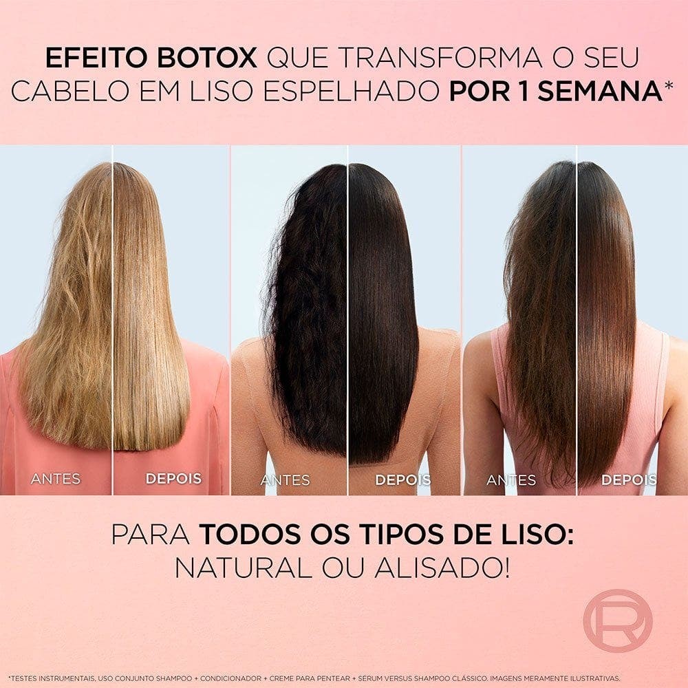 Com tecnologia ativada por calor, alinha e cria uma barreira invisível na fibra para 1 semana de cabelos lisos e à prova de umidade. Resultados que resistem até 5 lavagens. Testes instrumentais, uso conjunto de shampoo, condicionador, creme para pentear e sérum vs shampoo clássico Modo de Uso: Aplique somente nos cabelos úmidos, do comprimento às pontas, cobrindo todos os fios. Na 1ª aplicação da semana, ative a fórmula com a chapinha após a secagem. Ao longo da semana, após cada lavagem, reaplique e ative somente com o secador. Esqueça a chapinha por 1 semana. Agite antes de usar.
