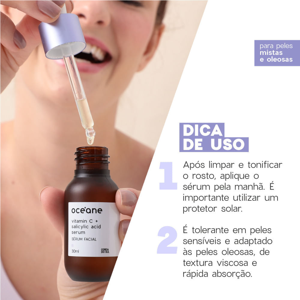 Os Ativos Vitamina C (10%) e Ácido Salicílico, Quando Combinados, Ajudam Na Renovação da Pele. a Vitamina C Previne e Trata Sinais de Envelhecimento. Ela Ajuda a Suavizar Rugas, Linhas de Expressão e Uniformizar a Tonalidade, Ao Clarear Manchas e Iluminar. Também Proporciona Uma Textura Mais Firme. Já o Ácido Salicílico Ajuda a Suavizar Poros Dilatados e a Controlar o Nível de Oleosidade. Para Quem: Tolerante em Peles Sensíveis e Adaptado às Peles Oleosas. Textura: Textura Viscosa e Rápida Absorção, Este Sérum Possui Um Acabamento Aveludado e Não Oleoso, Além de Fragrância Agradável. É o Aliado Perfeito para Deixar a Pele com Textura Uniforme e Um Toque de Luminosidade. Eficácia Garantida: Vitamina C - Ajuda a Suavizar Rugas, Linhas de Expressão; - Melhora a Firmeza da Pele; - Protege a Pele Contra Agressões Externas, Incluindo Radiação Uva e Uvb e Poluição; - Antioxidante: Neutraliza a Ação Dos Radicais Livres; - Potencializa a Proteção do Filtro Solar; - Ajuda No Clareamento de Manchas Na Pele - Uniformiza o Tom da Pele e Colabora para o Tratamento de Melasma, Manchas de Acne e de Sol; - Deixa a Pele Mais Luminosa; - Ajuda Na Produção de Novas Fibras de Colágeno e Elastina; - Hidrata a Pele Na Medida Certa, sem Deixá-La Oleosa; - Previne o Envelhecimento Precoce. Ácido Salicílico - Promove Uma Natural Esfoliação. Ao Esfoliar, o Ácido Salicílico Renova a Pele, Remove As Células Mortas e o Excesso de Oleosidade; - Ajuda a Prevenir a Proliferação de Bactérias e Fungos, Deixando a Pele Mais Saudável; - Regula a Oleosidade: Como Tem Efeito Comedolítico, Inibe a Formação Dos Cravos e Ajuda a Controlar a Produção de Sebo. Assim, Essa Substância Desobstrui Os Poros E, Consequentemente, Diminui a Incidência de Espinhas, Além de Diminuir a Produção Excessiva de Brilho.