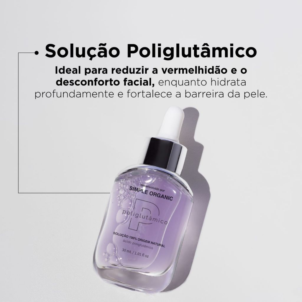 A Simple Organic é referência em clean beauty no Brasil, com produtos de high performance, ativos premium e tecnologia inovadora. Suas fórmulas são veganas, cruelty-free, sustentáveis e clinicamente testadas, garantindo resultados reais e seguros. Com eficácia comprovada por testes clínicos e recomendada por dermatologistas, a Simple Organic entrega muito mais do que beleza: oferece tratamentos eficazes, inovadores e responsáveis que cuidam da sua pele e do planeta. Sobre o produto: Solução Poliglutâmico Ideal para reduzir a vermelhidão na pele e o desconforto facial, a Solução Poliglutâmico possui uma fórmula 100 % natural, vegana, limpa e com impacto positivo. Foi desenvolvida para diminuir a irritação em regiões rosadas e avermelhadas, acalmar a pele e reduzir a reatividade causada por estímulos internos ou agressões externas. A Solução Poliglutâmico é uma ótima opção para tratar as peles extremamente ressecadas, pois além de acalmar a pele, ela promove uma hidratação intensa em 200% após 28 dias de uso. Ela também forma uma camada protetora suave, que deixa a superfície da pele mais elástica, macia e uniforme. A Solução é o resultado da união entre ativos naturais de alta performance com mecanismos de ação diferenciados que atuam de forma completa: o Ácido Poliglutâmico, o Complexo Botânico enriquecido com Zinco e a Piperonyl Glucose - um complexo de ativos inovadores capaz de acalmar a pele, clarear regiões irritadas e com vasos sanguíneos aparentes. Volume: 30 mL Quais são os ingredientes? Ativos: Ácido Poliglutâmico, Complexo Botânico enriquecido com Zinco e Piperonyl Glucose Composição: Aqua, Propanediol, Pentylene Glycol, Glycerin, Xanthan Gum, Polyglutamic Acid, Parfum, Apricot Kernel Oil Polyglyceryl-6 Esters, Polyglyceryl-10 Oleate, Hydrolyzed Garcinia Mangostana Fruit Extract, Sorbitan Palmitate, Cetyl Phosphate, Biosaccharide Gum-1, Piperonyl Glucoside, CI 77742, Saccharomyces/Zinc Ferment, Sodium Levulinate, Glyceryl Caprylate, Magnolol, Honokiol, p-Anisic Acid. *Origem Natural Composição (português): Água, Propanodiol, Pentileno Glicol, Glicerol, Goma Xantana, Ácido Poliglutâmico, Perfume, Ésteres do Óleo de Semente de Damasco Poliglicerila-6, Oleato de Poliglicerila-10, Extrato da Fruta de Mangostim Hidrolisado, Palmitato de Sorbitana, Fosfato de Cetila, Goma Biossacarídica-1, Glicosídeo Piperonila, Corante Violeta 77742, Fermento de Saccharomyces/Zinco, Levulinato de Sódio, Caprilato de Glicerila, Magnolol, Honoquiol, Ácido p-Anísico. *Origem Natural Como usar: Aplique algumas gotas no rosto limpo e massageie com as mãos até sua completa absorção. Onde usar: Rosto. Quantidade: 3 gotas. Quando usar: Uso diurno e noturno. Tipo de pele: Peles irritadas, com vermelhidão acompanhada de ardência. Acabamento: Pele macia e uniforme. Precauções: Uso externo. Manter longe do alcance de crianças. Evitar contato com os olhos. Armazenar em local seco, arejado, ao abrigo da luz e outras fontes de calor. Em caso de irritação, suspenda o uso e, se os sinais persistirem, procure um médico. Utilize protetor solar.