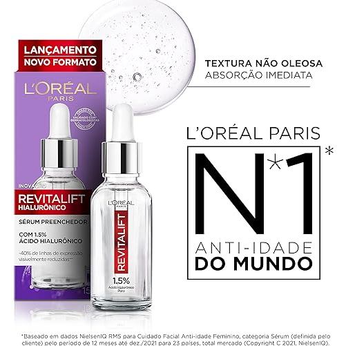 O Sérum Facial L'Oréal Revitalift Hialurônico possui ação anti-idade com ação preenchedora. Sua fórmula possui uma rápida absorção, sem sensação oleosa e não obstrui os poros. Com 1,5% de ácido Hialurônico, hidrata a pele e reduz até 40% das linhas de expressão em até 4 semanas. Testado com dermatologistas, o novo Sérum Preenchedor Revitalift Hialurônico é indicado para todos os tipos de pele e é adequado também para peles sensíveis. Benefícios: - Hidrata a pele; - Reduz até 40% das linhas de expressão; - Fácil aplicação; - Testado com dermatologistas; - Para todos os tipos de pele. Modo de usar: Utilizar a cada manhã ou noite, aplicando 2 a 3 gotas no rosto e pescoço. Para melhores resultados, use o resto da gama Revitalift Hialurônico. Sobre a marca: Desde 1909, a L'Oréal Profissional contribui com os produtos mais inovadores para os cabeleireiros, testados e aprovados pelos grandes nomes do mercado da beleza mundial. Estamos presentes nos maiores desfiles de moda e trabalhamos lado-a-lado com alguns dos mais talentosos hairstylists em bastidores e com os maiores salões. Desenvolvemos produtos que se adaptam às mais altas exigências dos profissionais que esperam contar com os melhores produtos para atingirem a sua melhor performance no melhor tempo.