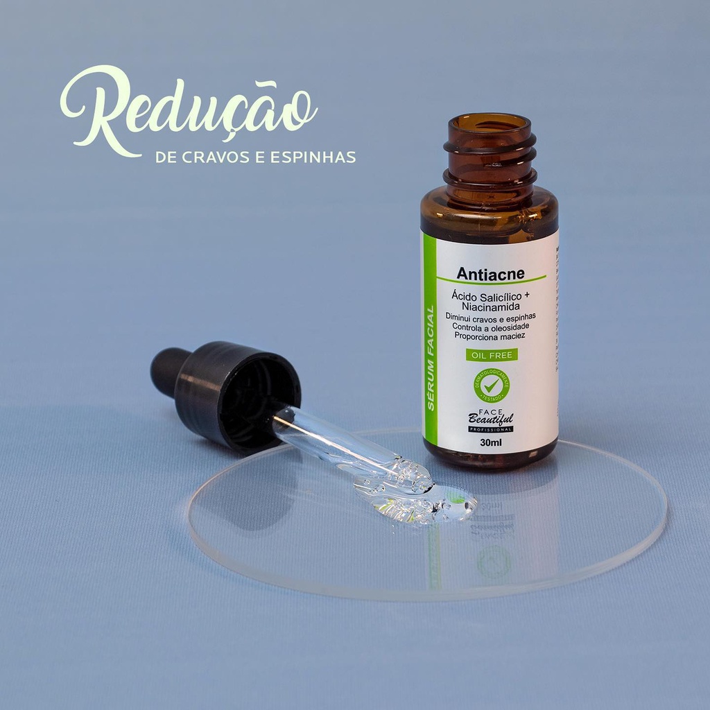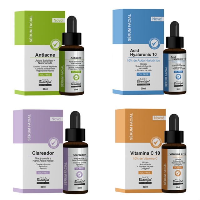 O Ácido Hialurônico 10 da Face Beautiful em forma de gel fluido não deixa aspecto oleoso, deixando a pele firme a hidratada irrigando as linhas finas de expressão. Características: - 10% de Ácido Hialurônico - Hidrata Suaviza linhas de Expressão - + Firmeza na Pele - Oil Free Modo de Uso: - Aplique o sérum após a limpeza e tonificação da pele; - Já de noite, use o produto antes do hidratante noturno; - Use Após a Limpeza e Tonificação; - Aplique uma quantidade pequena no Rosto ou no Pescoço; - Massageie em toda a área do Pescoço e do Rosto. ------------ Para quem se preocupa e gosta dos cuidados diários Skin Care, não pode deixar de conhecer e usar o Sérum Facial Clareador Oil Free. Pode ser utilizado por todos os tipos de pele, o Serum Clareador, auxilia na uniformização do tom da pele, e ainda ajudando a hidratação e nutrição facial. Sérum Clareador com Niacinamida e a Nano Partícula de Ácido KÓjico que tem uma potente ação clareadora na Pele, o Ácido Kójico se destaca por combater hiper pigmentação. Caracterísiticas: - Clareia e Ilumina - Revitaliza - Renova - Ajuda a Clarear as Manchas da Pele - Deixa a Pele com um Aspecto Saudável - Previne Rugas Modo de Usar: - Aplicar algumas gotas do sérum sob a pele limpa e seca; - Espalhar com movimentos circulares até a absorção do produto; - Aplicar sempre no período noturno, lavar o rosto após amanhecer; - Sempre Aplicar em dias Intercalados, 3x na semana. --------------- Sérum anti acne com ácido salicílico, com eficácia comprovada, atua tanto na prevenção no surgimento de novas espinhas como também no tratamento das já existentes. Também com Pantenol que irá atuar como hidratante da pele. Características: - Antiacne - Ácido Salicílico - Niacinamida - Diminui cravos e espinhas - Controla a oleosidade - Proporciona Maciez - Testado dermatologicamente MODO DE USO: No uso diário aplique nas áreas do rosto com tendência a acne como tratamento ou prevenção. Evite a área dos olhos. Durante a primeira semana de uso, use em dias intercalados. Use proteção solar durante o dia quando estiver em tratamento. Peso Líquido : 30 ml ------------ O sérum facial Vitamina C da Face Beautiful é um poderoso Antioxidante, sua fórmula com vitamina C estimula a produção de colágeno na pele, dando maior elasticidade e deixando a pele hidratada e uniforme. Oil Free; Contém: 30ml; Antioxidante; + firmeza na pele; Colágeno; Hidratação;]