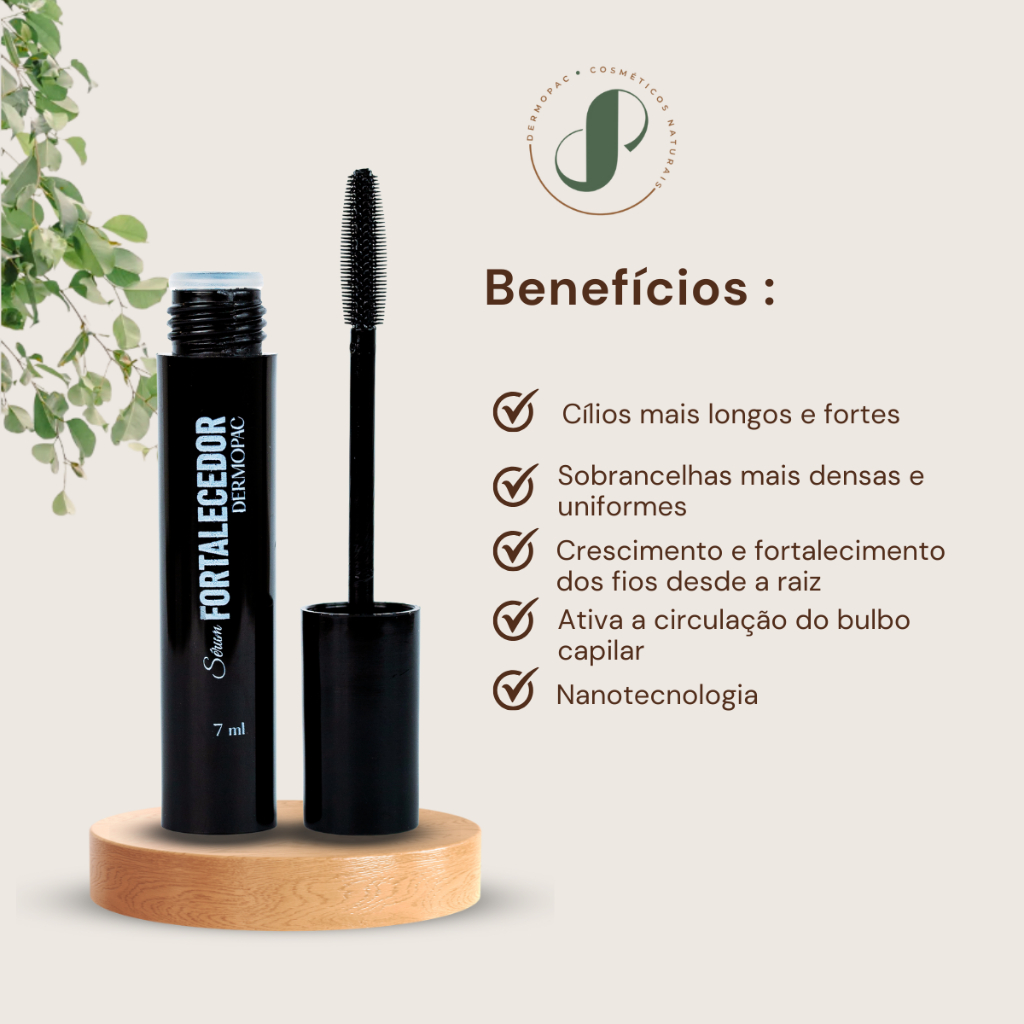 Sérum Fortalecedor Dermopac com Nanotecnologia 7ml – Crescimento de Cílios e Sobrancelhas O Sérum Fortalecedor Dermopac com Nanotecnologia é um tratamento inovador desenvolvido para estimular o crescimento, fortalecer e aumentar o volume dos cílios e sobrancelhas, de forma natural e segura. Sua fórmula em gel de base aquosa (Química Verde) conta com nanotecnologia microencapsulada, que favorece a melhor absorção dos ativos, potencializando os resultados. Proporciona fios mais longos, espessos, resistentes e uniformes, além de sobrancelhas visivelmente mais densas. Enriquecido com Extrato de Jaborandi, conhecido por sua ação revitalizante capilar, o sérum atua na nutrição do bulbo capilar, auxilia na ativação da circulação periférica e ajuda a reduzir a queda dos fios, mantendo a saúde dos pelos e da pele. Produto testado dermatológica e oftalmologicamente, ideal para uso diário. Principais Benefícios Estimula o crescimento de cílios e sobrancelhas Aumenta o volume e a densidade dos fios Fortalece e auxilia na redução da queda Hidrata e mantém a saúde dos fios e da pele Tecnologia de nanotecnologia microencapsulada Gel de fácil espalhabilidade e boa fixação Olhar mais marcante e natural Modo de Uso Aplicar o produto nos cílios e sobrancelhas, duas vezes ao dia, com a pele limpa e seca. Composição Aqua (Água), Propanediol (Propanodiol), Glycerin (Glicerol), Ammonium Acryloyldimethyltaurate/VP Copolymer (Copolímero de Acriloildimetiltaurato de Amônio/VP), Pilocarpus Microphyllus Leaf Extract (Extrato da Folha de Jaborandi), Propylene Glycol (Propileno Glicol), Caprylyl Glycol (Caprililglicol), Ethylhexylglycerin (Etilhexilglicerina), Aminomethyl Propanol (Aminometilpropanol), Algin (Alginato de Sódio), Sodium Benzoate (Benzoato de Sódio), Potassium Sorbate (Sorbato de Potássio), Citric Acid (Ácido Cítrico), Calcium Citrate (Citrato de Cálcio). Informações Adicionais Marca: Dermopac Produto: Sérum Fortalecedor com Nanotecnologia Volume: 7ml Indicação: Cílios e sobrancelhas Textura: Gel Base: Aquosa – Química Verde Cor da embalagem: Preta Testado dermatológica e oftalmologicamente Cruelty Free EAN: 7901022200511 Perguntas Frequentes (FAQ) Ajuda no crescimento dos cílios e sobrancelhas? Sim. O uso contínuo auxilia no crescimento, fortalecimento e aumento do volume dos fios. Em quanto tempo aparecem os resultados? Os resultados variam, mas geralmente são percebidos após algumas semanas de uso regular. Pode ser usado nos olhos? Sim. Produto testado dermatológica e oftalmologicamente, indicado para cílios e sobrancelhas. Pode usar maquiagem após aplicar? Sim. Após a absorção do produto, a maquiagem pode ser aplicada normalmente. Serve para homens e mulheres? Sim. Indicado para todos os gêneros. Precauções Uso externo. Conservar em local fresco e ao abrigo da luz. Manter fora do alcance de crianças e animais. Em caso de sensibilidade, suspender o uso. Este produto pode sofrer alteração de cor por conter ingredientes naturais, o que não altera sua qualidade.
