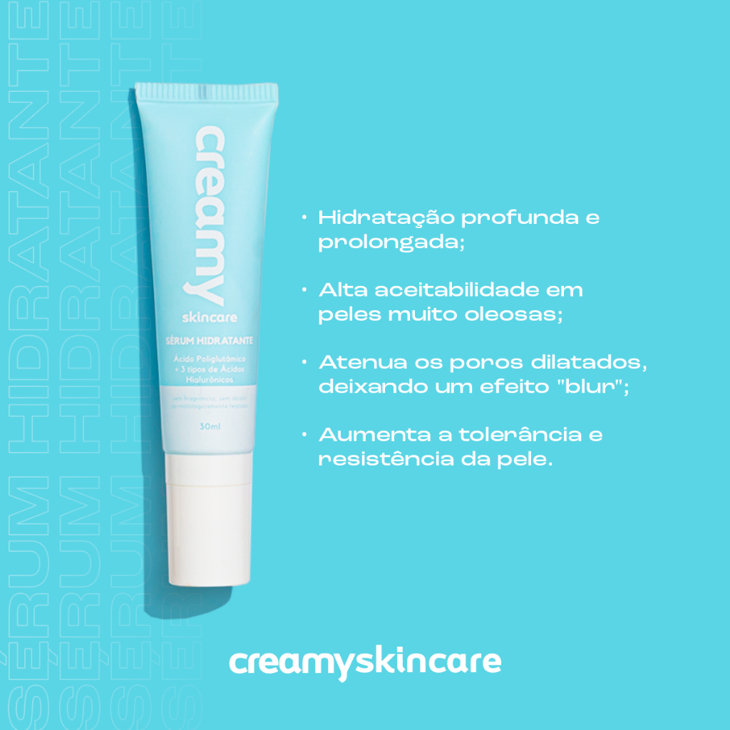 O que é? O sérum hidratante da Creamy Skincare traz uma combinação exclusiva de 3 tipos de ácidos hialurônicos associados ao ácido poliglutâmico, ingredientes com poderoso efeito hidratante que em conjunto agem em todas as camadas da pele. O ácido poliglutâmico é um biopolímero natural capaz de atrair água e formar um filme de hidratação que reduz a sua evaporação, deixando a pele do rosto mais firme, macia e hidratada por mais tempo. Os três tipos de ácido hialurônico agem em profundidades diferentes da pele: Enquanto as moléculas de baixo e médio peso molecular tem ação nas camadas intermediárias da pele, o ácido hialurônico de baixíssimo peso molecular age nas camadas mais profundas, oferecendo uma hidratação prolongada e profunda. É Um sérum leve, aquoso, com alto poder de hidratação, ideal para todos os tipos de pele, inclusive as mais oleosas.