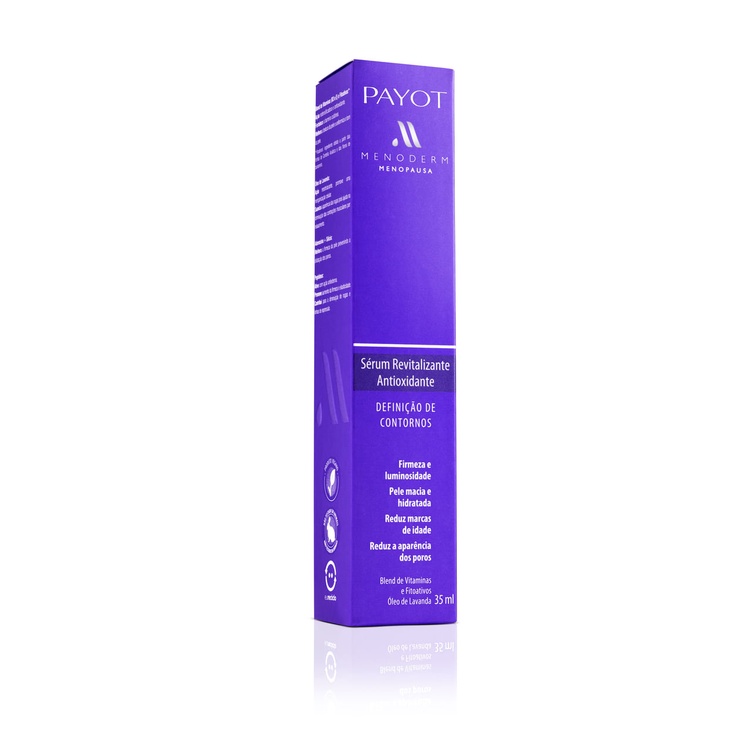 O Sérum Revitalizante Antioxidante Menoderm Payot foi especialmente desenvolvido para suavizar os efeitos que as mudanças hormonais causam na pele. Ajuda na definição de contornos, pois tonifica e fortalece a pele nas áreas mais sensíveis. Ameniza as marcas de envelhecimento nos lábios superiores, pescoço e área dos olhos. Combate perda de firmeza e elasticidade. Reduz a aparência de rugas e linhas finas de expressão. Possui uma combinação de ativos que promove ação antioxidante, hidrata e revitaliza o rosto e pescoço. Proporciona uma aparência mais uniforme. Diminui os poros e deixa a pele mais viçosa e luminosa. Textura leve facilmente absorvida pela pele. Produto livre de álcool, parabenos e corantes.Vegano e Não Testado em Animais. Blend de Vitaminas (B3 e E) e Fitoativos*: Ação redensificadora e antioxidante. Fortalece a barreira cutânea. Melhora a textura da pele e uniformiza o tom da pele. *Fitoativos: ingrediente obtido a partir das folhas de Centella Asiática e das flores de bananeira. Óleo de Lavanda: Ação reestruturante, promove uma reorganização celular. Suaviza a aparência das rugas pois ajuda na diminuição das contrações musculares por relaxamento. Adenosina + Silício: Melhora a firmeza da pele prevenindo a dilatação dos poros. Peptídeos: Ativo com ação antiedema. Promove aumento da firmeza e elasticidade. Contribui para a diminuição de rugas e linhas de expressão Testes clínicos comprovam*: • 88% pele mais hidratada • 88% perceberam redução na aparência dos poros • 85% pele mais viçosa e luminosa • 85% perceberam menos marcas de envelhecimento nos lábios superiores, pescoço e área dos olhos • 82% perceberam melhora na firmeza da pele *Testes clínicos comprovam a eficácia do produto com estudo realizado durante 30 dias de uso contínuo em 33 mulheres na faixa de 40 a 65 anos. Indicação: Água, Extrato de Semente de Plantago Lanceolata, Nicotinamida, Óleo de Semente de Girassol, 1,2 Hexanodiol, Esqualano, Butilenoglicol, Dextrana, Etoxidiglicol, Amido de Milho, Poliacrilato de Sódio, Triglicerídeos dos Ácidos Cáprico e Caprílico, Adenosina Modo de Uso: Diariamente, pela manhã e à noite, aplicar sobre a pele limpa e seca do rosto e pescoço, espalhando com movimentos circulares até completa absorção. Uso externo. Ingredientes: Água, Extrato de Semente de Plantago Lanceolata, Nicotinamida, Óleo de Semente de Girassol, 1,2-Hexanodiol, Esqualano, Butilenoglicol, Dextrana, Etoxidiglicol, Amido de Milho, Poliacrilato de Sódio, Triglicerídeos dos Ácidos Cáprico e Caprílico, Adenosina, Extrato de Flor de Musa Sapientum, Extrato de Centella Asiática, Xilitol, Goma Tara, Acetil Tetrapeptídeo-5, Ácido Caprílico, Monoestearato de Glicerila, Fenoxietanol, Alginato de Sódio, Extrato de Lavandula Stoechas, Acetato de Tocoferila, Silanotriol, Caprililglicol, Perfume (Cumarina, Limoneno, Linalol), Edetato Dissódico. Precauções: Manter o produto bem fechado, em lugar seco, ao abrigo da luz direta e longe do calor excessivo. Este produto foi formulado de maneira a minimizar possível surgimento de alergia. Descontinuar o uso em caso de sensibilização. Manter fora do alcance de crianças. Atenção Validade: Maio/26