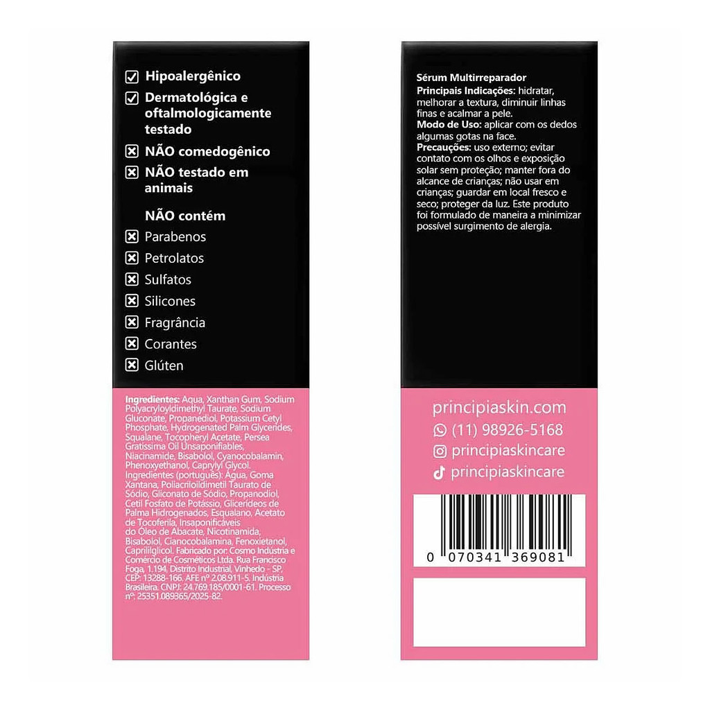 Sérum Multirreparador Principia Mix-03 30ml INDICAÇÕES Principais - Amenizar a irritação - Promover hidratação - Proporcionar maciez - Suavizar rugas e linhas finas Complementares - Aumentar a firmeza e elasticidade - Melhorar o viço Tipos de pele - Todos COMPROVAÇÕES Estudo de Eficácia Percebida: Participantes que, após 60 dias de uso, notaram melhora em - linhas finas › 100% - hidratação › 100% - textura › 100% - descamação› 100% - viço › 100% Estudo de Comedogenicidade e Acnegenicidade: Não apresentou efeito comedogênico e acnegênico. Avaliação de Irritabilidade Primária, Acumulada e Sensibilização Cutânea: O produto não causou irritação em nenhum dos participantes, sendo considerado seguro para uso tópico, suportando desta forma o termo "dermatologicamente testado". Avaliação Dermatológica de Potencial Foto irritante e Fotossensibilizante: O produto não induziu processo fotossensibilizante e foto irritante em nenhum dos participantes, sendo seguro para uso tópico e considerado hipoalergênico. Estudo de Aceitabilidade Dérmica em Condições de Uso: O produto foi considerado seguro para uso em humanos, dermatológica e clinicamente testado. Estudo de Aceitabilidade Oftalmológica em Condições de Uso: O produto foi considerado oftalmologicamente testado. INGREDIENTES ATIVOS ESQUALANO Derivado de plantas tais como a cana-de-açúcar, tem propriedades emolientes, antioxidantes e anti-inflamatórias, formando uma barreira que evita a perda de água, protege a pele contra danos causados pela exposição ao sol e ameniza a irritação e vermelhidão da pele. BISABOLOL De origem vegetal, apresenta propriedades anti-inflamatórias e antioxidantes, proporcionando efeito calmante, inibindo a ação das citoquinas pró-inflamatórias, moléculas associadas à irritação da pele, sendo um ingrediente indicado inclusive para peles alérgicas, com lesões leves e sensibilizadas. MULTIVITAMINAS Inclui as vitaminas E, B12 e B3 (também conhecida como Niacinamida). Esta combinação possui alta eficácia na hidratação, melhora da textura e uniformização da pele. Sua ação antioxidante protege contra os danos causados por radicais livres, enquanto estimula a regeneração celular, proporcionando mais viço e maciez. MANTEIGA DE ABACATE Possui ação regeneradora e reconstrutiva, auxiliando na reparação da pele e no fortalecimento da barreira cutânea, ajuda a manter a firmeza e a elasticidade, além de promover a hidratação da pele. MODO DE USO - Use diariamente de manhã e a noite - Aplique antes de cremes, protetor solar e maquiagem - Deixe o rosto limpo e seco - Sem encostar a cânula da pele, dispense algumas gotas nos dedos ou diretamente na face - Espalhe suavemente pelo rosto, inclusive na área dos olhos ADVERTÊNCIAS - Evite contato com os olhos e exposição solar sem proteção - Mantenha fora do alcance de crianças - Guarde em local fresco e seco