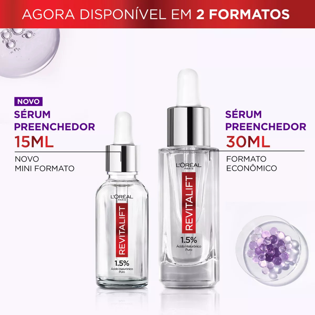 O novo Sérum Preenchedor Revitalift Hialurônico de L'Oréal Paris, é um sérum anti-idade com ação preenchedora. Sua fórmula possui uma rápida absorção, sem sensação oleosa e não obstrui os poros. Com 1,5% de ácido Hialurônico, hidrata a pele e reduz até 40% das linhas de expressão em até 4 semanas. Testado com dermatologistas, o novo Sérum Preenchedor Revitalift Hialurônico é indicado para todo tipo de pele e é adequado também para peles sensíveis. Ácido Hialurônico: o que é e como age na pele? É uma substância produzida naturalmente pelo organismo e presente na pele, mas a sua produção decai com o passar dos anos. Possui um alto poder preenchedor, capaz de manter até 1000 vezes o seu peso em água hidratando e preenchendo a pele, devolvendo a vitalidade e combatendo linhas de expressão. No Sérum Revitalift Hialurônico de L’Oréal Paris, ele está presente em duas versões: - MICRO ÁCIDO HIALURÔNICO: hidrata e preenche a superfície da pele - MACRO ÁCIDO HIALURÔNICO: penetra profundamente preenchendo rugas e linhas de expressão Resultados Visíveis: - Em uma semana*: a pele parece mais radiante, com sensação de preenchida e firme. - Em duas semanas**: redução das linhas de expressão (-19%) e redução de rugas (-14%). - Em 4 semanas**: redução das linhas de expressão (-40%) e redução de rugas (-31%). Validação feita por um painel consultivo de dermatologistas contratados pela L'Oréal. *Estudos em consumidores com 55 mulheres **Estudo clínico em 53 mulheres por 4 semanas