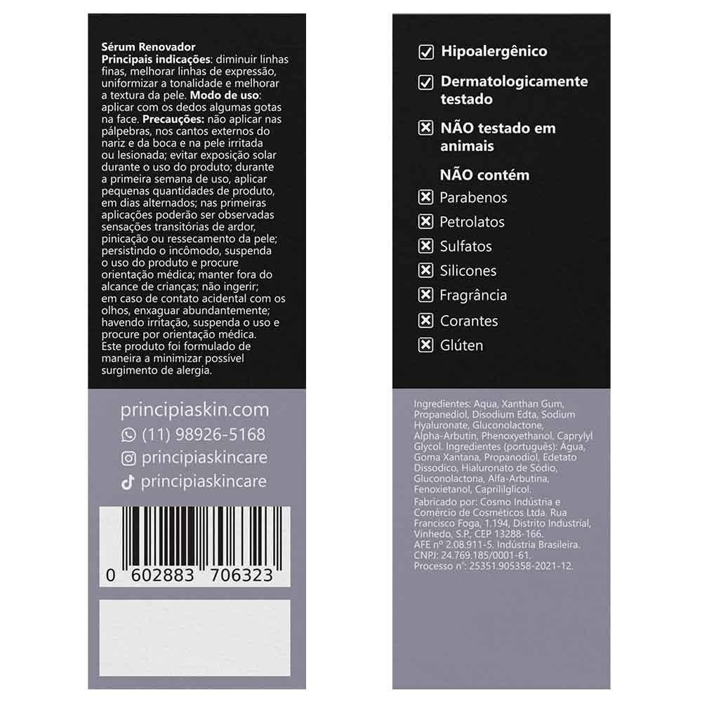 Sérum com 2% de Alfa-Arbutin e 10% de Gluconolactone com alta eficácia na redução de manchas escuras, suavização da textura, melhora do viço e aumento da hidratação da pele. INDICAÇÕES Principais » Reduzir e uniformizar a pigmentação » Clarear manchas escuras » Melhorar o viço Complementares » Promover hidratação » Aumentar a firmeza e elasticidade » Diminuir olheiras e bolsas » Proporcionar maciez Tipos de pele » Todos INGREDIENTES ATIVOS ALFA-ARBUTIN Ingrediente ativo biossintético que atua na síntese de melanina epidérmica regulando a pigmentação da pele, uniformizando seu tom e reduzindo manchas escuras. GLUCONOLACTONE Obtido através da oxidação da glicose do milho, este polihidroxiácido de alto peso molecular penetra lentamente na pele, proporcionando uma esfoliação mais suave que a dos alfa hidroxiácidos, sendo indicado inclusive para peles sensíveis. Devido aos múltiplos grupos hidroxila em sua estrutura molecular, contribui com a hidratação da pele e reconstrução da barreira natural do tecido epitelial, aumentando sua capacidade de autoproteção contra agentes irritantes. MODO DE USO » Aplique em noites alternadas por uma semana, depois todas as noites » Use antes de cremes, protetor solar e maquiagem » Deixe o rosto limpo e seco » Sem encostar a cânula da pele, dispense algumas gotas nos dedos ou diretamente na face » Espalhe suavemente pelo rosto, inclusive na área dos olhos » Não aplique nas pálpebras, nos cantos externos do nariz e da boca e na pele irritada ou lesionada » Evite exposição solar durante o uso do produto » Durante a primeira semana de uso, aplique pequenas quantidades de produto, em dias alternados » Nas primeiras aplicações poderão ser observadas sensações transitórias de ardor, pinicação ou ressecamento da pele » Havendo irritação, suspenda o uso e procure por orientação médica » Mantenha fora do alcance de crianças » Em caso de contato acidental com os olhos, enxague abundantemente » Guarde em local fresco e seco DÚVIDAS FREQUENTES Contém parabenos, petrolatos e sulfatos? Não. Sua composição também não inclui silicones, fragrância nem glúten. Está regularizada na Anvisa? Sim, conforme o processo número 25351.905358-2021-12. Foi testada em animais? Não. A PRINCIPIA não realiza testes em animais. Qual o prazo de validade? Três anos, contados da data de fabricação. Pode ser usada junto com outras fórmulas? Sim. Praticamente não há restrições para uso conjunto com outros ativos. Pode ser aplicada na área do olhos? Sim, sua segurança e eficácia foram comprovadas também na área dos olhos. Causa acnes ou cravos? Não. Pelo contrário, costuma ter efeito benéfico e ser recomendada para peles acnêicas.