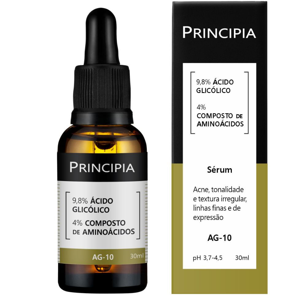 Sérum Principia Ácido Glicólico Ag 10 Sérum com 9,8% de ácido glicólico e 4% de composição de aminoácidos para melhora visível das linhas finas e de expressão, acne, tonalidade e textura irregular da