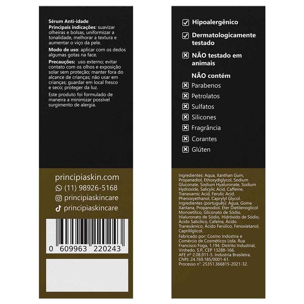 Sérum com 5% de Cafeína, 3% de Ácido Tranexâmico e 0,5% de Ácido Ferúlico com alta eficácia contra olheiras, bolsas e manchas. INDICAÇÕES Principais » Reduzir e uniformizar a pigmentação » Clarear manchas escuras » Diminuir olheiras e bolsas Complementares » Melhorar o viço Tipos de pele » Todos INGREDIENTES ATIVOS ÁCIDO TRANEXÂMICO Um derivado sintético do amino ácido lisina, atua em mecanismos que influenciam a pigmentação da pele, com eficácia comprovada em testes clínicos na redução de manchas escuras, inclusive as relacionadas a incidência de acnes e a exposição solar. ÁCIDO FERÚLICO Presente em sementes, folhas e cascas de plantas, como um ácido livre ou na forma de éster. Devido a suas propriedades antioxidante e anti-inflamatória, desempenha função protetora de componentes da estrutura da pele como queratinócitos, fibroblastos, colágeno e elastina. CAFEÍNA Um alcaloide metilxantina encontrado em diversas fontes de origem natural como grãos de café e folhas de chá. Com propriedades vasoconstritora, anti-inflamatória e antioxidante, tem alta eficácia contra olheiras e bolsas na área dos olhos, e na redução e clareamento de manchas na pele. MODO DE USO » Use diariamente de manhã e a noite » Aplique antes de cremes, protetor solar e maquiagem » Deixe o rosto limpo e seco » Sem encostar a cânula da pele, dispense algumas gotas nos dedos ou diretamente na face » Espalhe suavemente pelo rosto, especialmente na área dos olhos » Evite contato com os olhos e exposição solar sem proteção » Não use em crianças » Guarde em local fresco e seco DÚVIDAS FREQUENTES Contém parabenos, petrolatos e sulfatos? Não. Sua composição também não inclui silicones, fragrância nem glúten. Está regularizada na Anvisa? Sim, conforme o processo número 25351.366815-2021-32. Causa descamação da pele? Em geral, não provoca descamação visível da pele. Foi testada em animais? Não. A PRINCIPIA não realiza testes em animais. Qual o prazo de validade? Três anos, contados da data de fabricação. Pode ser usada junto com outras fórmulas? Sim, praticamente não há restrições para uso com outros ativos. Pode ser aplicada na área do olhos? Sim. Sua segurança e eficácia foram comprovadas, especialmente na área dos olhos. Causa acnes ou cravos? Não. Pelo contrário, costuma ter efeito benéfico e ser recomendada para peles acnêicas.