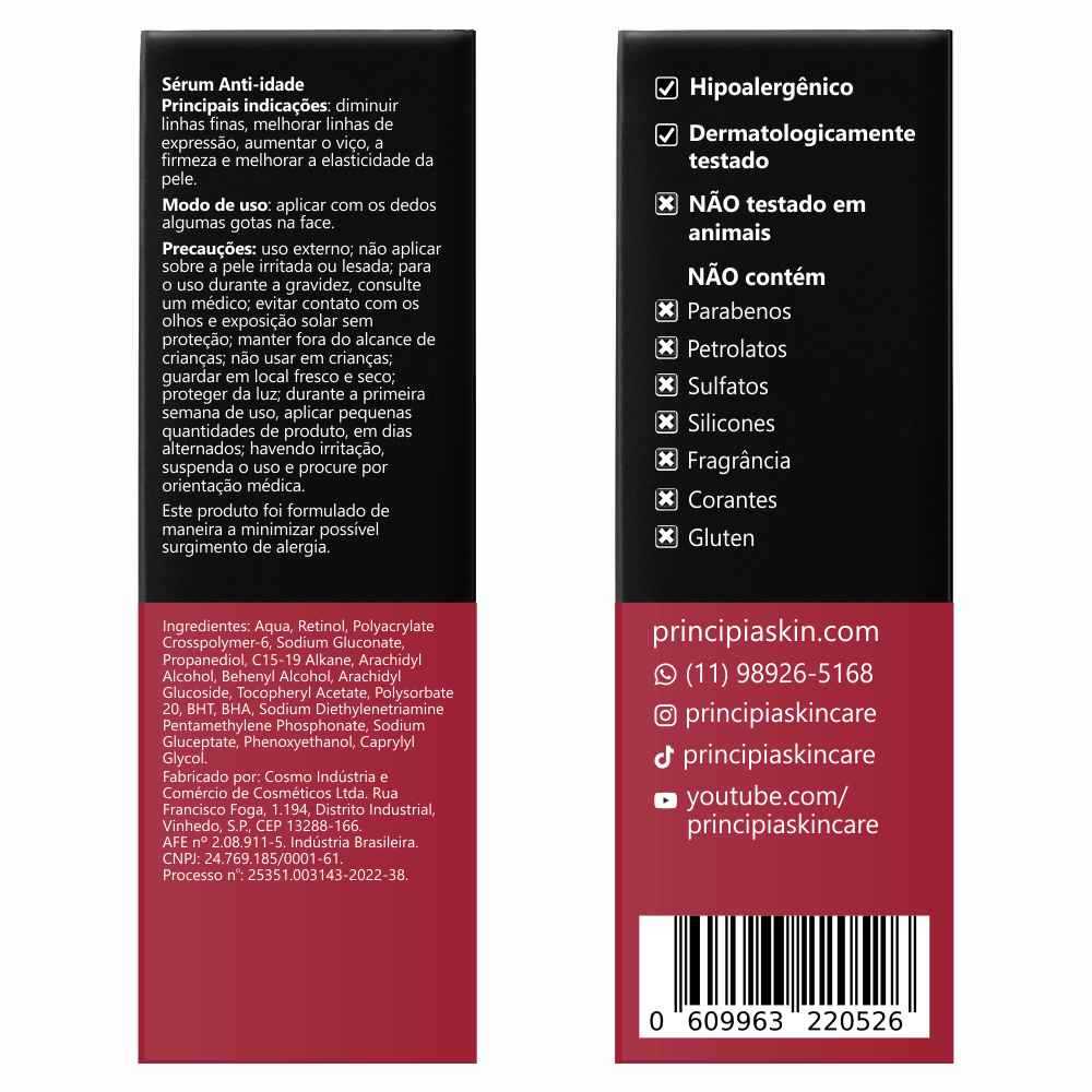 Sérum Principia Rn-0,3 Retinol e Vitamina E 30ml Indicações: Principais * Aumentar a firmeza e elasticidade * Suavizar rugas e linhas finas * Melhorar o viço Complementares * Reduzir e uniformizar a