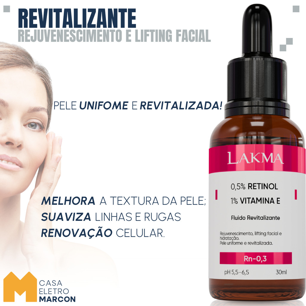 Grandes Mudanças Começam no Cotidiano! A Casa Eletro Marcon é parceira oficial da LAKMA oferecendo aos nossos clientes produtos originais, lacrados e com Nota Fiscal, garantindo excelente experiência de compra, agilidade na entrega Full e garantia direta da fábrica por 3 meses. Sérum Facial Premium Hidratante 30mL - Lançamento de excelência para cuidados com sua pele! HOME CARE Sinta a transformação a cada uso. Experimente uma pele profundamente hidratada e rejuvenescida com o Sérum Facial Premium Hidratante 30mL. Desenvolvido com uma fórmula exclusiva e de alta performance, ele oferece hidratação intensa, melhora a elasticidade e suaviza linhas finas, promovendo uma aparência revitalizada e saudável. Ideal para todos os tipos de pele, este sérum é essencial para uma rotina de cuidados eficaz e sofisticada. *Principais Benefícios e Ingredientes: - Retinol: Estimula a renovação celular, suaviza linhas finas e melhora a textura da pele, deixando-a mais uniforme e radiante. - Vitamina E: Um antioxidante poderoso que hidrata profundamente e protege a pele contra os danos causados por radicais livres. Com uma textura leve e de rápida absorção, o Sérum Facial Premium Hidratante penetra profundamente na pele, deixando-a macia, tonificada e com um brilho saudável desde a primeira aplicação. *Modo de Usar: - Aplicar uma quantidade adequada do produto nos dedos e espalhá-lo suavemente sobre o rosto. O uso é diário, podendo ser realizado pela manhã (acompanhado de protetor solar) ou à noite. *Precauções: - Não aplique nas pálpebras, nos cantos externos do nariz e da boca, ou em pele irritada ou lesionada. - Evite exposição solar durante o uso do produto. - Durante a primeira semana de uso, aplique pequenas quantidades de produto em dias alternados. - Havendo irritação, suspenda o uso e procure orientação médica. - Mantenha fora do alcance de crianças. - Em caso de contato acidental com os olhos, enxágue abundantemente. - Guarde em local fresco e seco. - Para uso durante a gravidez, consulte um médico. - Não indicado para uso em crianças. *Não contém: - Parabenos - Petrolatos - Sulfatos - Silicones - Fragrâncias - Corantes - Glúten Inclua o Sérum Facial Premium Hidratante 30mL na sua rotina e descubra uma pele mais jovem, hidratada e cheia de vitalidade. Dermatologicamente testado, lacrado e com Nota Fiscal, garantindo segurança, qualidade e eficácia. Eleve seu cuidado com a pele para um novo nível.
