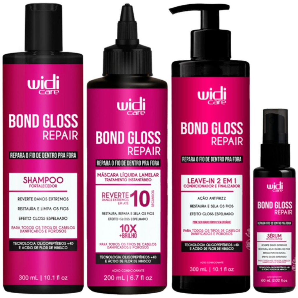 Sérum Widi Care Bond Gloss Repair 60ml O Sérum Reconstrutor Widi Care traz uma fórmula inovadora com Oligopeptídeos +4D e Ácido de Flor de Hibisco, que penetra até o córtex, a parte mais profunda do fio, reconstruindo ligações capilares quebradas, restaurando a estrutura interna dos cabelos e devolvendo brilho intenso e visível. Ideal para todos os tipos de cabelos danificados e porosos, o sérum prolonga o efeito do tratamento e protege os fios contra novas agressões. • Reverte danos extremos • Restaura, sela e blinda os fios • Repara pontas duplas • Efeito gloss espelhado como usar Coloque uma pequena quantidade do sérum nas mãos e aplique nos fios secos ou úmidos, no comprimento e pontas. Uso diário. Use a linha Bond Gloss Repair para melhores resultados.