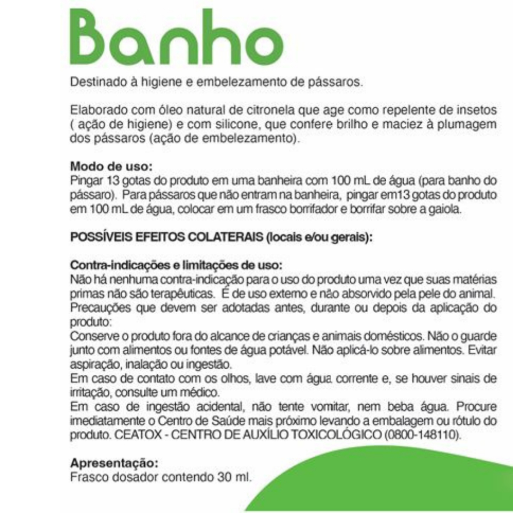 Seta Banho Pássaros Banho Seta - 30ml Seta Banho é destinado à higiene e embelezamento de pássaros. Repelente natural de piolhos, moscas, mosquitos e ácaros. Elaborado com citronela que age como repelente de insetos (ação de higiene) e com silicone, que confere brilho e maciez à plumagem dos pássaros (ação de embelezamento). Repele os insetos. Modo de Uso Pingar 13 gotas do produto em uma banheira com 100 mL de água (para banho do pássaro). Para pássaros que não entram na banheira, pingar em13 gotas do produto em 100 mL de água, colocar em um frasco borrifador e borrifar sobre a gaiola. Conteúdo: Frasco contendo 30 ml. Fórmula Octametilciclotetrassiloxano B.H.T (hidróxido de tolueno butilado) Metilparabeno Propilparabeno Óleo de citronela Polisorbato 80 Veículo (água) q.s.p
